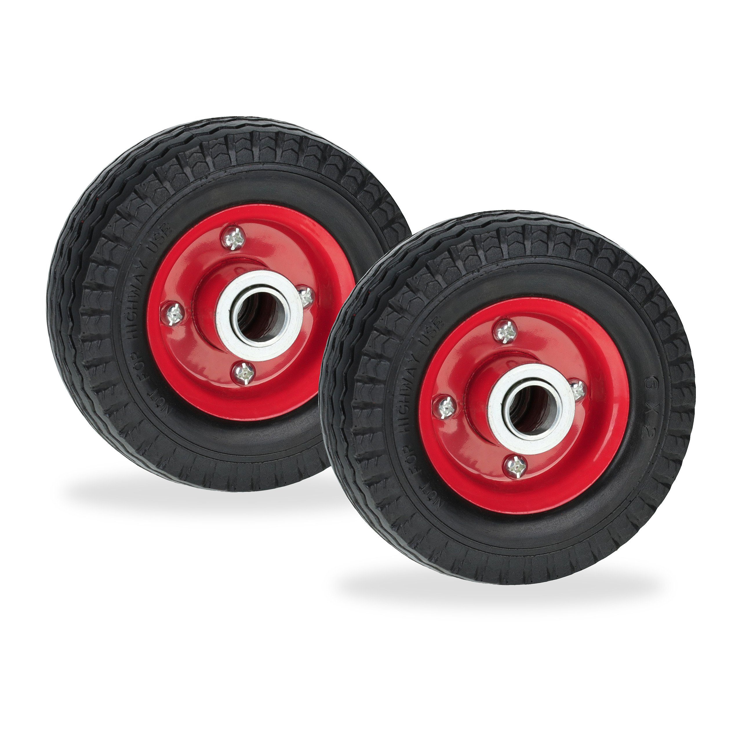 Mit den Rädern aus Vollgummi holst Du Dir pannensichere Reifen für Deinen Roller oder E-Scooter. Die Ersatzreifen ohne Luft sind unempfindlich gegen Dornen, Nägel und andere spitze Gegenstände und verfügen über einen geringen Rollwiderstand, was für eine einfache Handhabung sorgt. Da kein Luftverlust nach längerer Standzeit droht, sind die Vollgummireifen außerdem immer einsatzbereit. Das robuste Kugellager des Komplettreifens sorgt dank geringer Reibungen für einen hohen Fahrkomfort. Räder 2er Set im Detail - Größe: 6 x 2" - Rad Durchmesser: ca. 15 cm - Rad Breite: ca. 5 cm - Tragkraft: ca. 50 kg - Gewicht: je ca. 550 g - Material: Vollgummi (PU), Stahl - Farbe: Schwarz, Rot