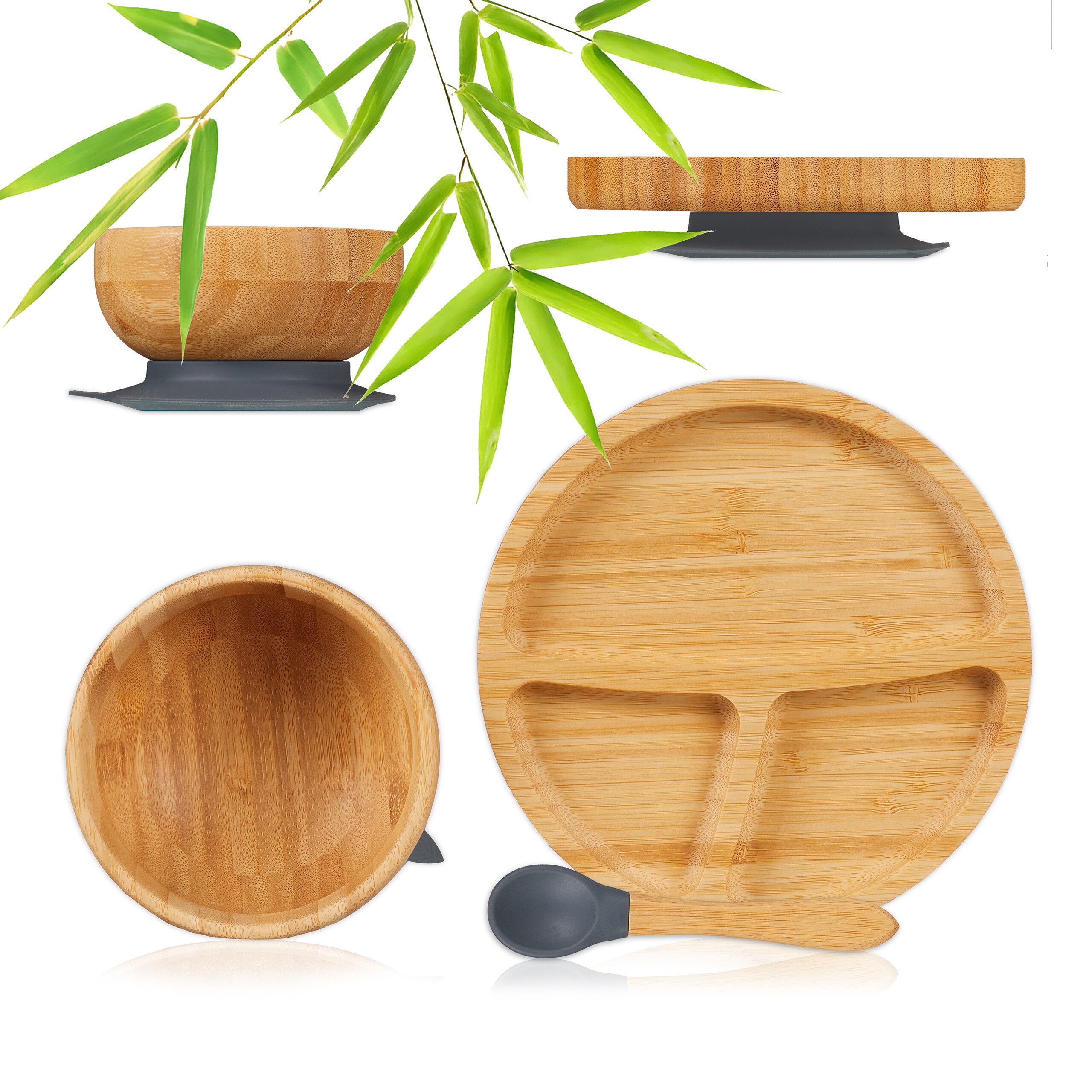 Babygeschirr mit Saugnapf - Set mit Teller, Schale und Löffel - Perfekt für die Einführung der Beikost - Starker Silikon-Saugnapf verhindert Umkippen oder Herunterfallen des Geschirrs - Unterteilter Teller mit 3 Fächern ist ideal für babygeleitetes Essen (Baby Led Weaning) - Aus naturbelassenem Bambus und BPA-freiem Silikon für sorgenfreien Genuss - Beikost-Babyzubehör als schöne Geschenkidee zu Geburt oder 1. Geburtstag