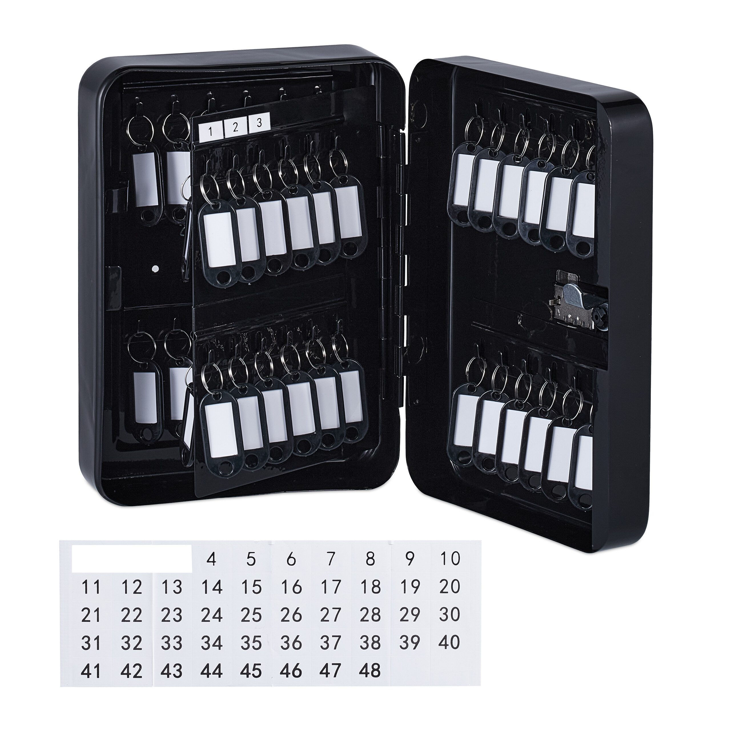 In dieser Schlüsselbox mit 48 Haken werden Schlüssel sicher und griffbereit gelagert. Das Schloss mit 3-stelligem Zahlencode schützt dabei gegen unbefugten Zugriff. Behalte immer den Überblick, indem Du die Plätze und Schlüssel nummerierst, sodass die Familie zu Hause oder Mitarbeiter im Betrieb leichter zurechtkommen. Aus robustem Eisen gefertigt, wird der stabile Schlüsselschrank mit dem zugehörigen Material an der Wand montiert – ein nützliches Tool für Büro, Hotel oder Werkstatt.