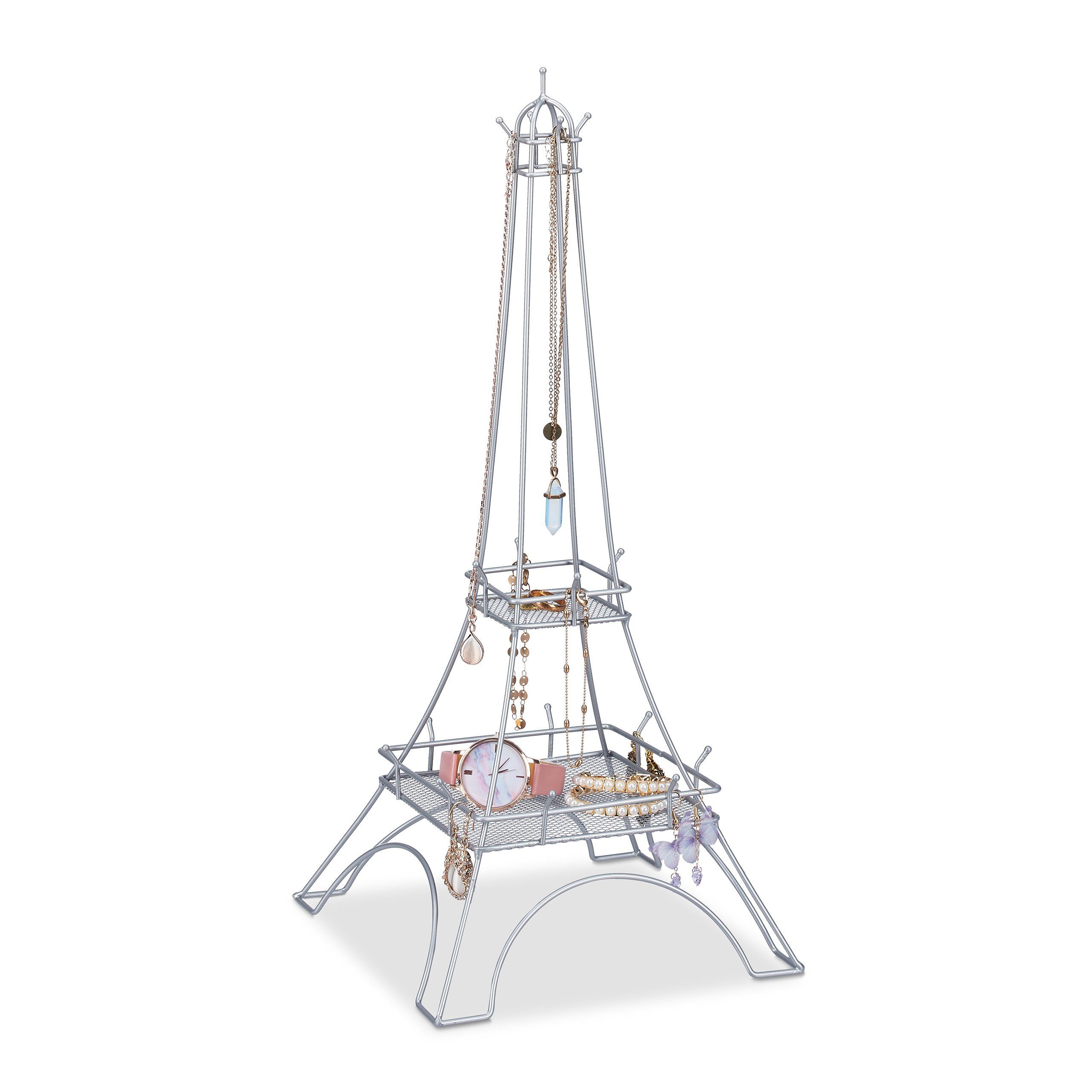 Mit diesem Schmuckaufhänger gehören verhedderte Halsketten der Vergangenheit an. Der Schmuckständer aus Metall bietet auf 17 Haken Platz für unterschiedlich lange Ketten. Aber auch Ringe, Armreifen und Uhren lassen sich übersichtlich auf den 2 Ablagen der Schmuckhalterung verstauen. Dank der außergewöhnlichem Optik in Form des Pariser Eiffelturmes, ist der Kettenbaum das ideale Wohnaccessoire für alle Frankreich-Fans.