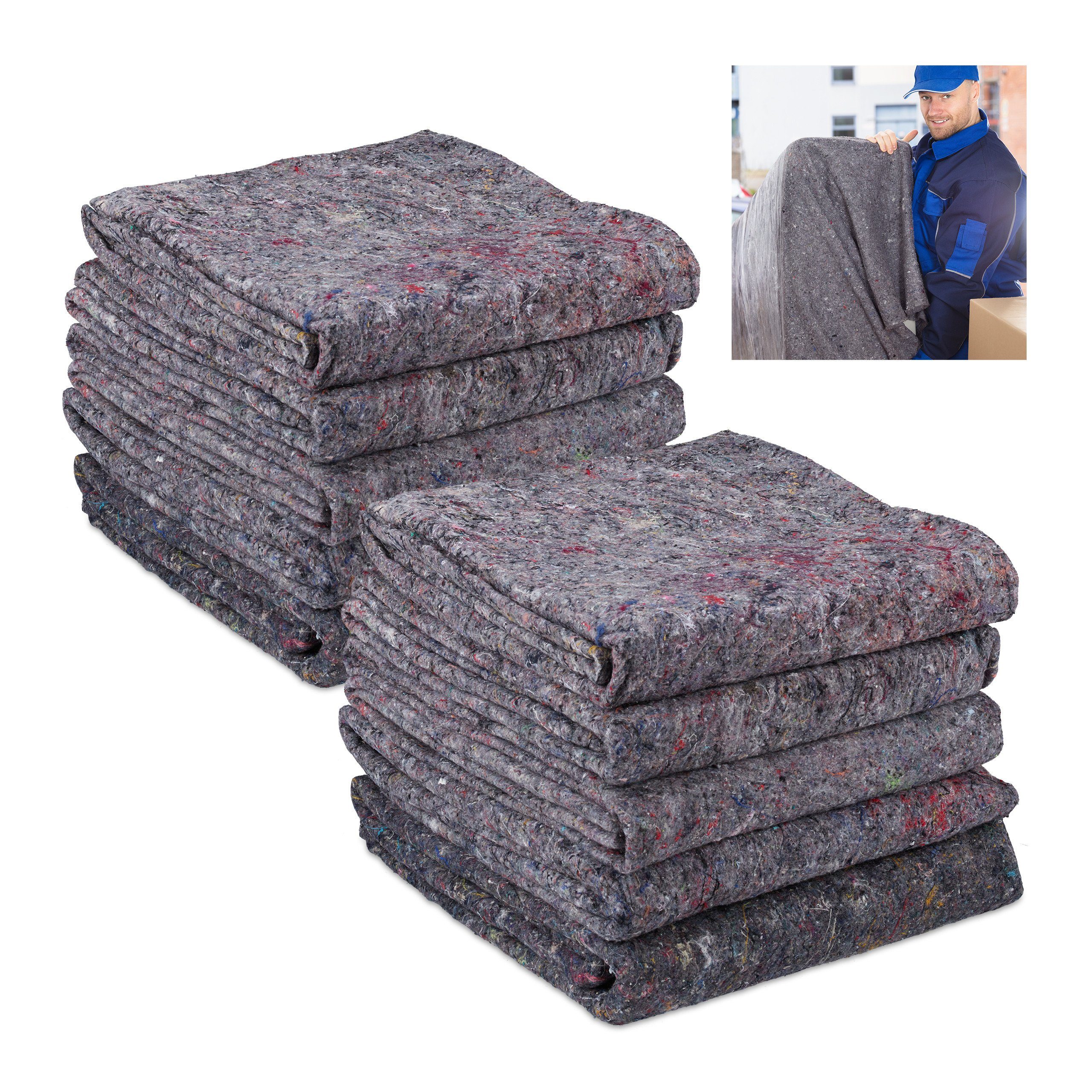Damit das alte Sprichwort "Dreimal umziehen ist so schlimm wie einmal abbrennen“ sich nicht bewahrheitet, ist es wichtig, Ihre Möbel und empfindlichen Gegenstände bei einem Umzug gut zu schützen. Nichts eignet sich dafür besser als diese robusten Möbelpackdecken im praktischen 10er Pack. Die Schutzdecken sind aus 100% recyceltem Vlies gefertigt und können mehrmals wiederverwendet werden. Auch wenn mal wieder Maler- und Renovierungsarbeiten anstehen, sind die Decken nützliche Helfer.