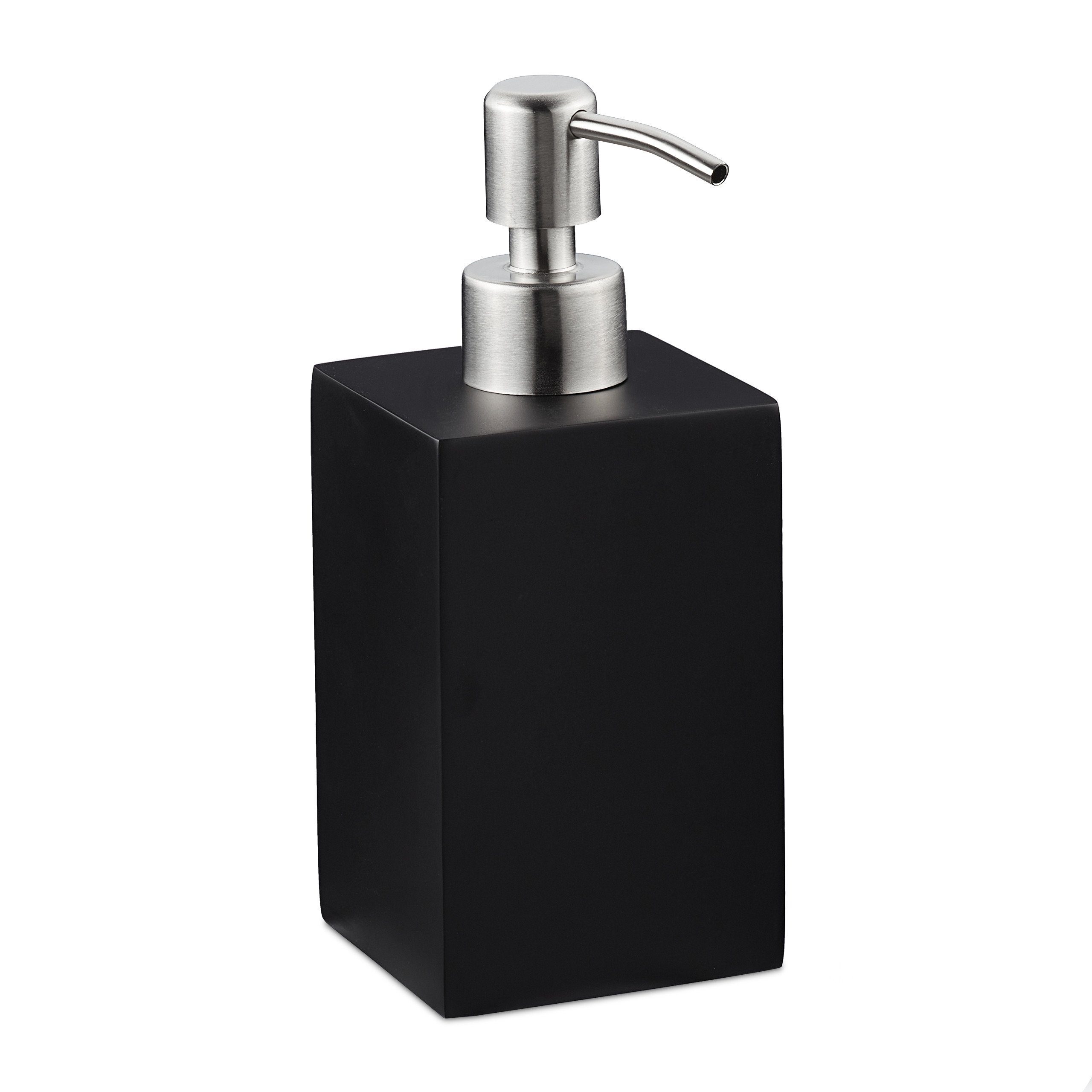 Der eckige Seifenspender im 2er Set ist nicht nur dekorativ, sondern auch vielseitig einsetzbar. Ob Seife, Lotion, Duschgel, Shampoo oder auch Spülmittel - mit den Pumpspendern lassen sie sich optimal dosieren. Falls die Seifenspender einmal leer sein sollten, lassen sie sich durch Abschrauben der Pumpvorrichtung einfach neu befüllen. Das edle Design aus glatten Kunststein und einem Pumpkopf aus Edelstahl macht die Handseifenspender zu eleganten Accessoires für Bad, WC und Küche. Farbe: schwarz