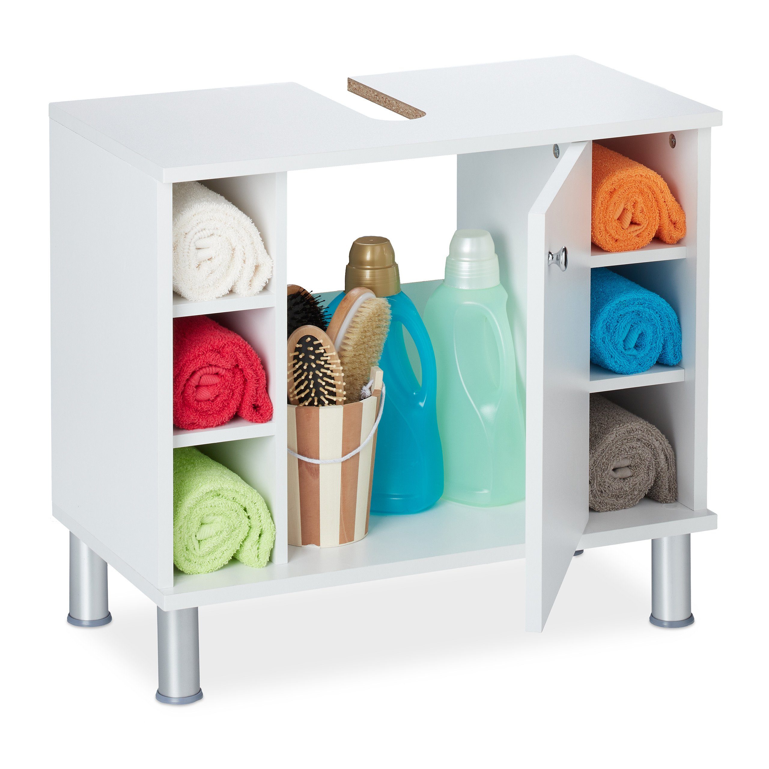 Mit dem Unterschrank nutzen Sie den freien Platz unter Ihrem Waschbecken effizient aus. Durch den eingearbeiteten Ausschnitt passt der Badschrank ideal um den Waschbecken-Siphon. Der geräumige Innenraum hinter der Tür bietet ausreichend Platz für Waschmittel, Handtücher, Toilettenpapier und Reserve Duschgel. Die 6 offenen Fächer sind ideal, um kleine Badutensilien immer griffbereit zu haben. Das schlichte weiße Design fügt sich in jedes Bad ein.