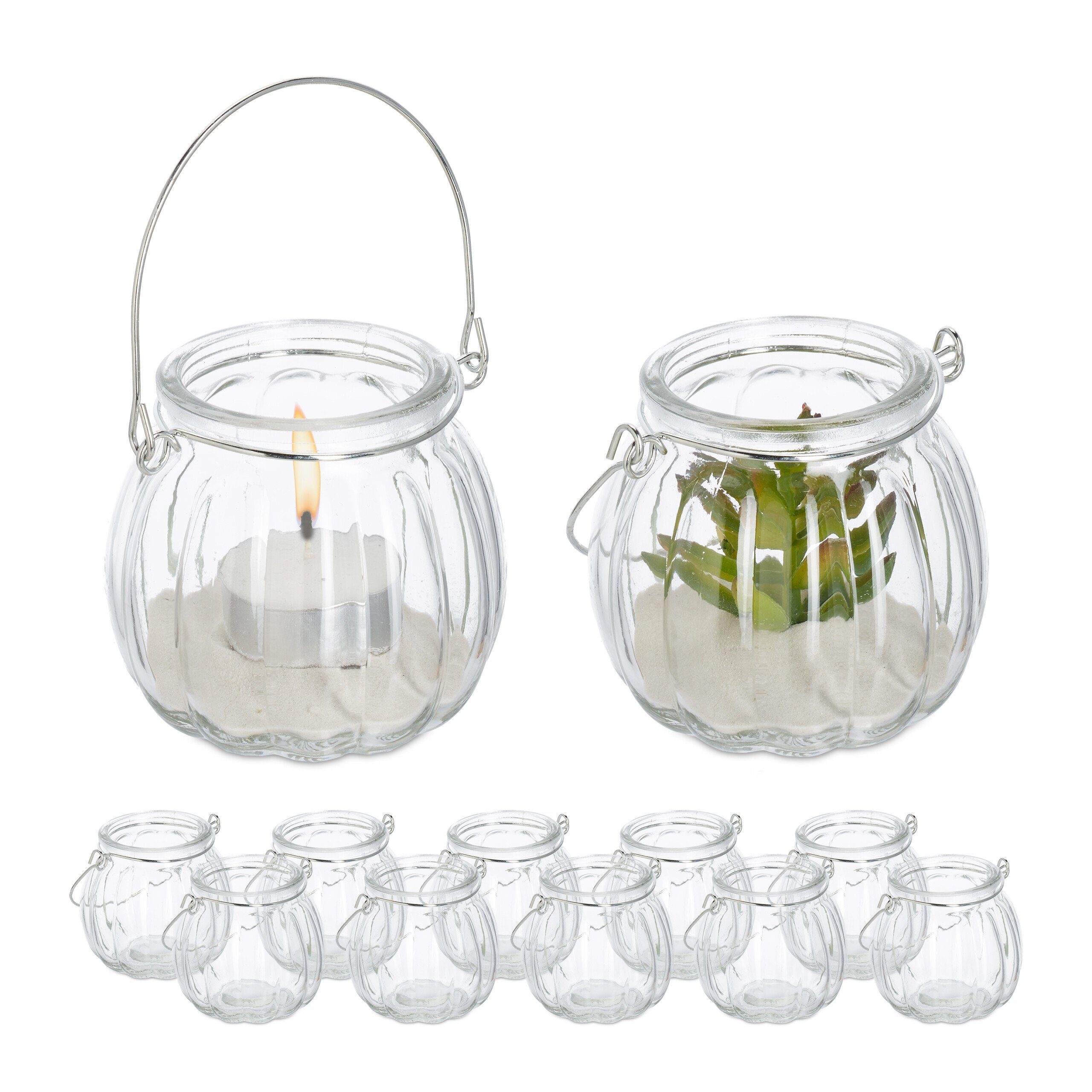 Set: 12 Windlichter aus Glas mit Henkel aus silbernem Metall - Ideale Deko für Drinnen und Draußen