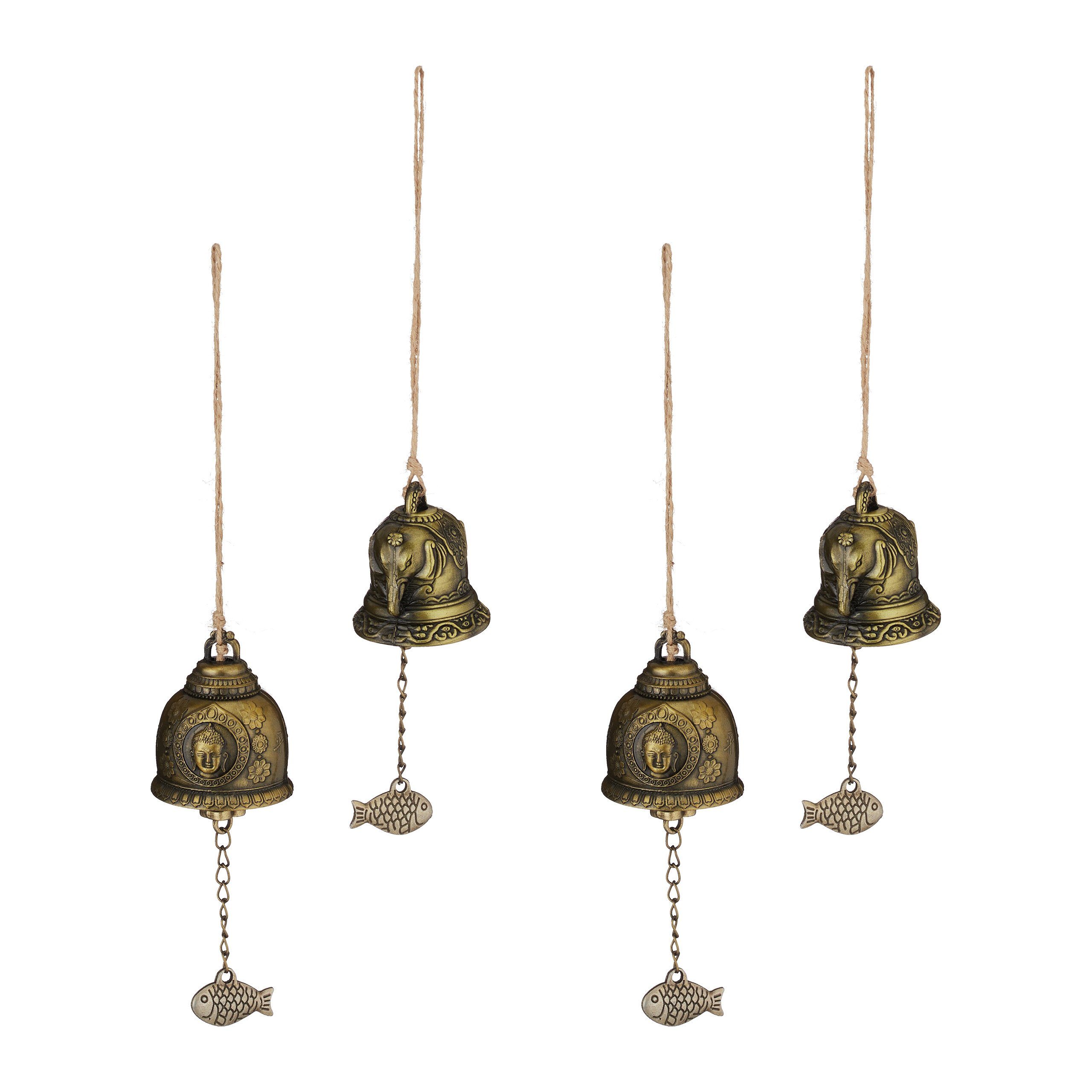 Dekorativ: Verziertes Klangspiel mit Asia Flair - 2 Glocken mit Buddha und 2 Glocken mit Elefanten