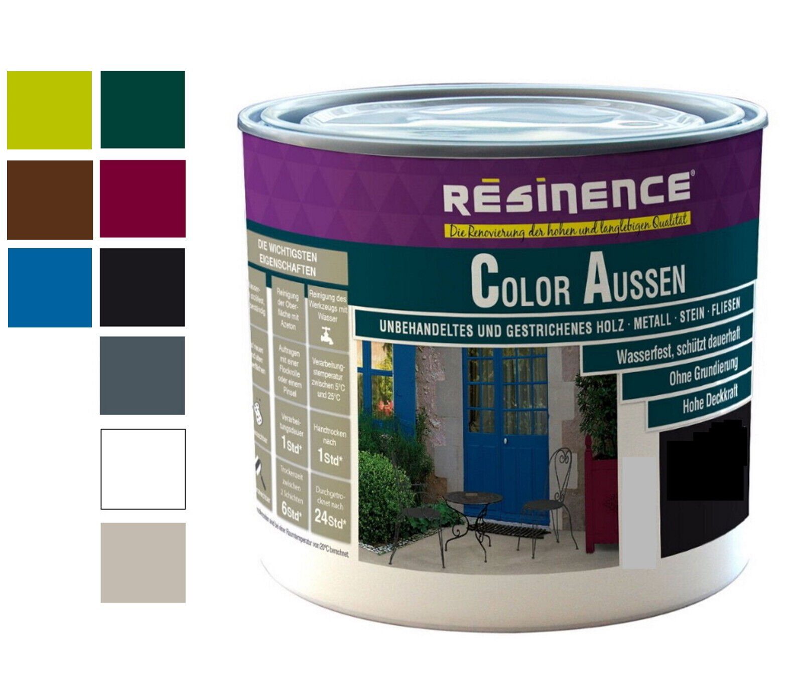 Resinence Color Aussen 250 ml oder 500 ml Renovieren und gestalten Sie Ihre Flächen im Außenbereich. Color Aussen ist ein 2-Komponenten-Kunstharz angereichert durch ein Härtemittel zur Renovierung und zum Schutz von vielen Oberflächen. Die Oberflächen werden wasserdicht und unempfindlich gegen tägliche äußere Einflüsse Die hochwertige Zusammensetzung ermöglicht eine einfache Anwendung und außerordentliche Haltbarkeit. Eigenschaften: - Für viele Oberflächen (neu und alt) - Ohne Grundierung anwendbar - wasserfest und schützt dauerhaft - sehr gute Haltbarkeit - garantierter Schutz für 8 Jahre Werkzeug: Rolle oder Pinsel. Ziel: Color Aussen ist geeignet für Fensterläden, Türen, Tore, Böden und Möbel aus: - Holz: unbehandelt oder gestrichen, lasiert oder versiegelt - Stein: Fliesen, Feinsteinzeug, Keramik, Beton - Metall: Eisen, verzinkt (gegen Rost vorbehandelt), Aluminium. - Nicht geeignet für Kunststoffe und Tropenhölzer. Anwendung: Tragen Sie Color Aussen mit einer Rolle oder einem Pinsel ohne Grundierung direkt auf die Oberfläche auf. Um der Oberfläche einen maximalen Schutz und Widerstandsfähigkeit gegen mechanische Belastung und Nässe zu verleihen, empfehlen wir das Auftragen von zwei Schichten der Hochschutz-Versiegelung Color auf allen horizontalen Flächen. Reinigung der Werkzeuge: Mit Wasser. Trocknung: Verarbeitungsdauer 1 Stunde, Handtrocken nach ca. 1 Stunde, Trockenzeit zwischen 2 Schichten 6 Stunden, durchgetrocknet nach ca. 24 Stunden. Ergiebigkeit: 250 ml reichen für ca. 2,5m² / 500 ml reichen für ca. 5m².