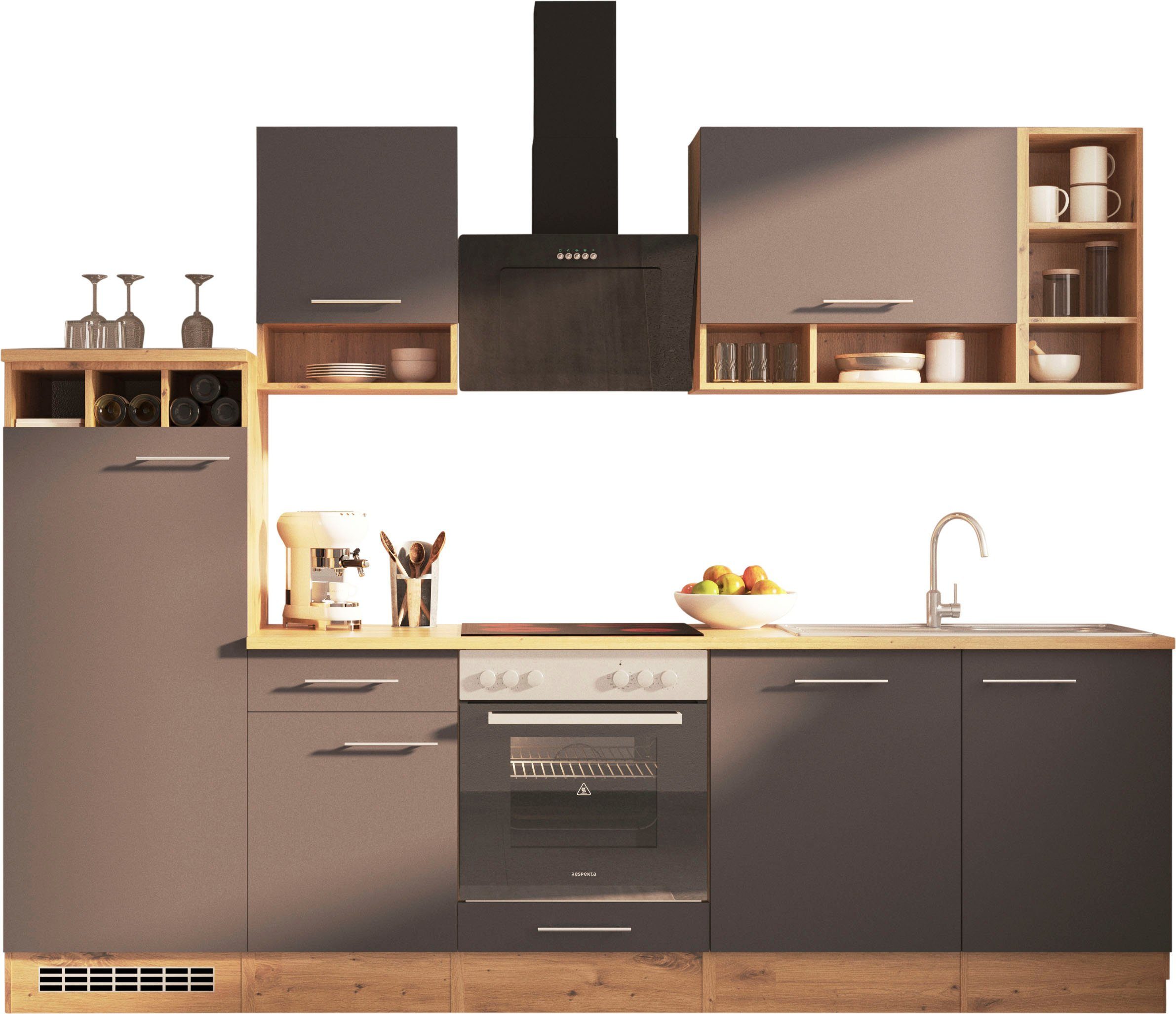 Ausstattung | Durchgehende Arbeitsplatte Seitenverkehrt stellbar Sockelhöhe nicht verstellbar inkl. Edelstahl-Einbauspüle, mit Abtropffläche mit E-Geräten |