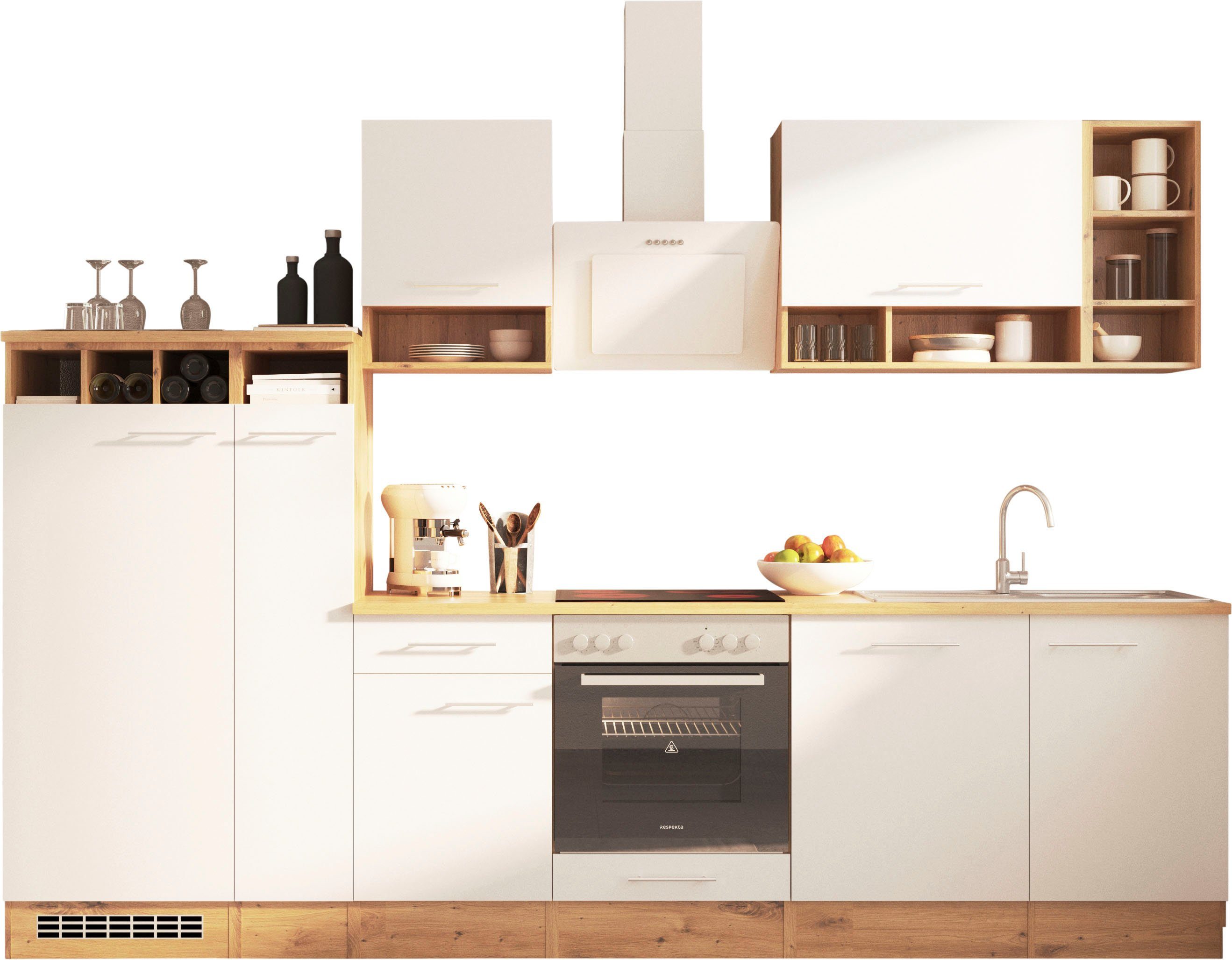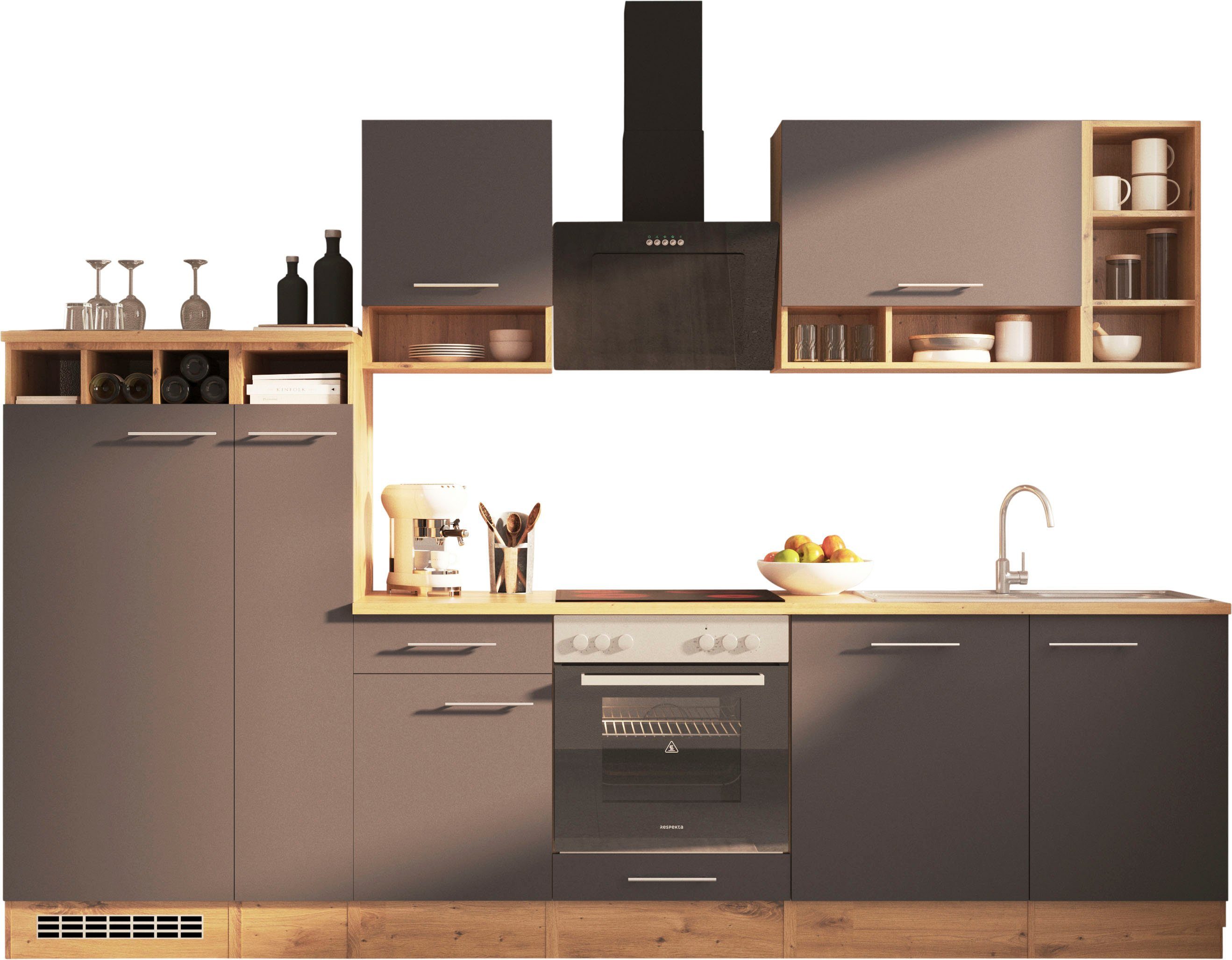 Ausstattung | Durchgehende Arbeitsplatte Seitenverkehrt stellbar Sockelhöhe nicht verstellbar inkl. Edelstahl-Einbauspüle, mit Abtropffläche mit E-Geräten |