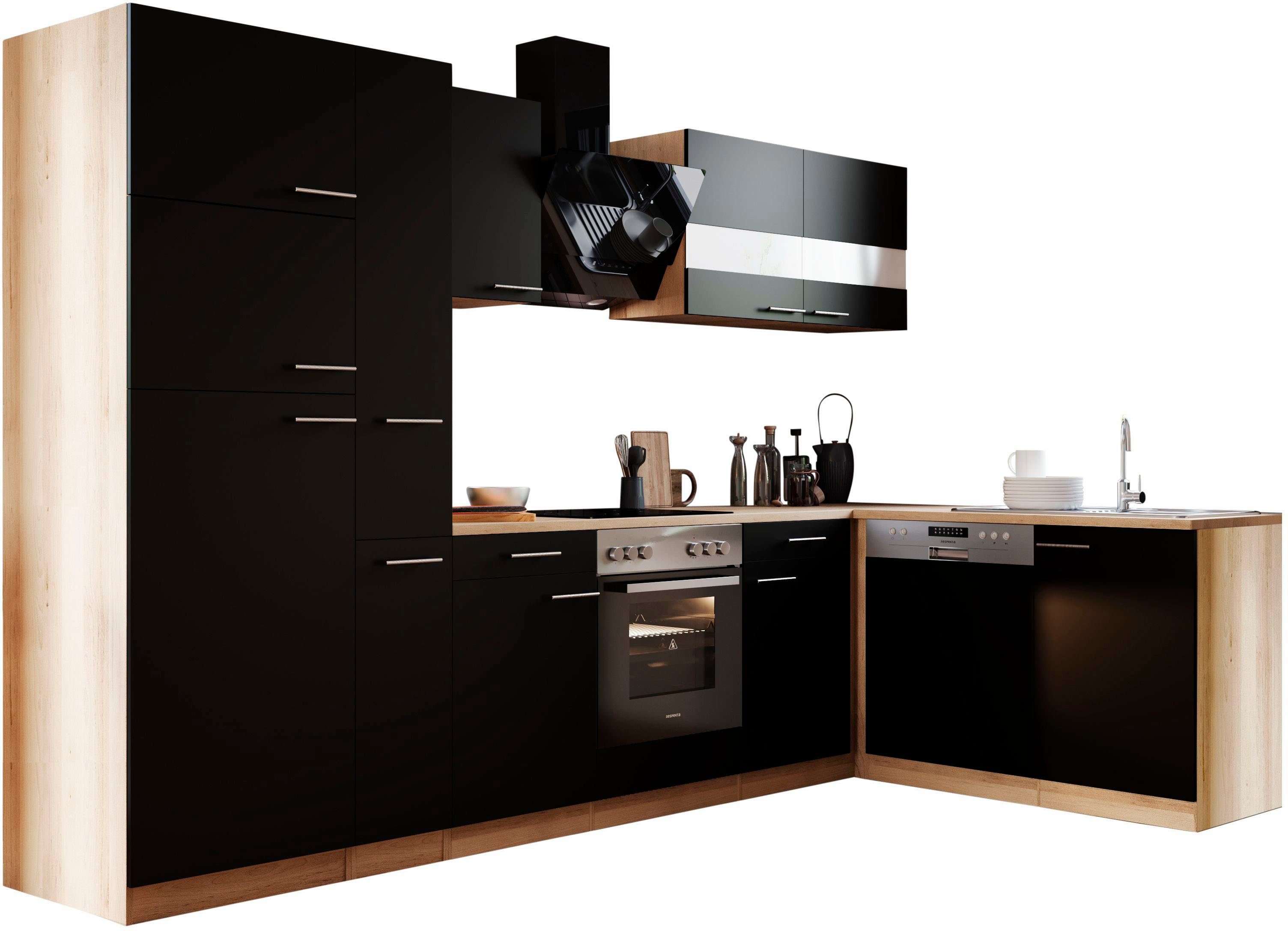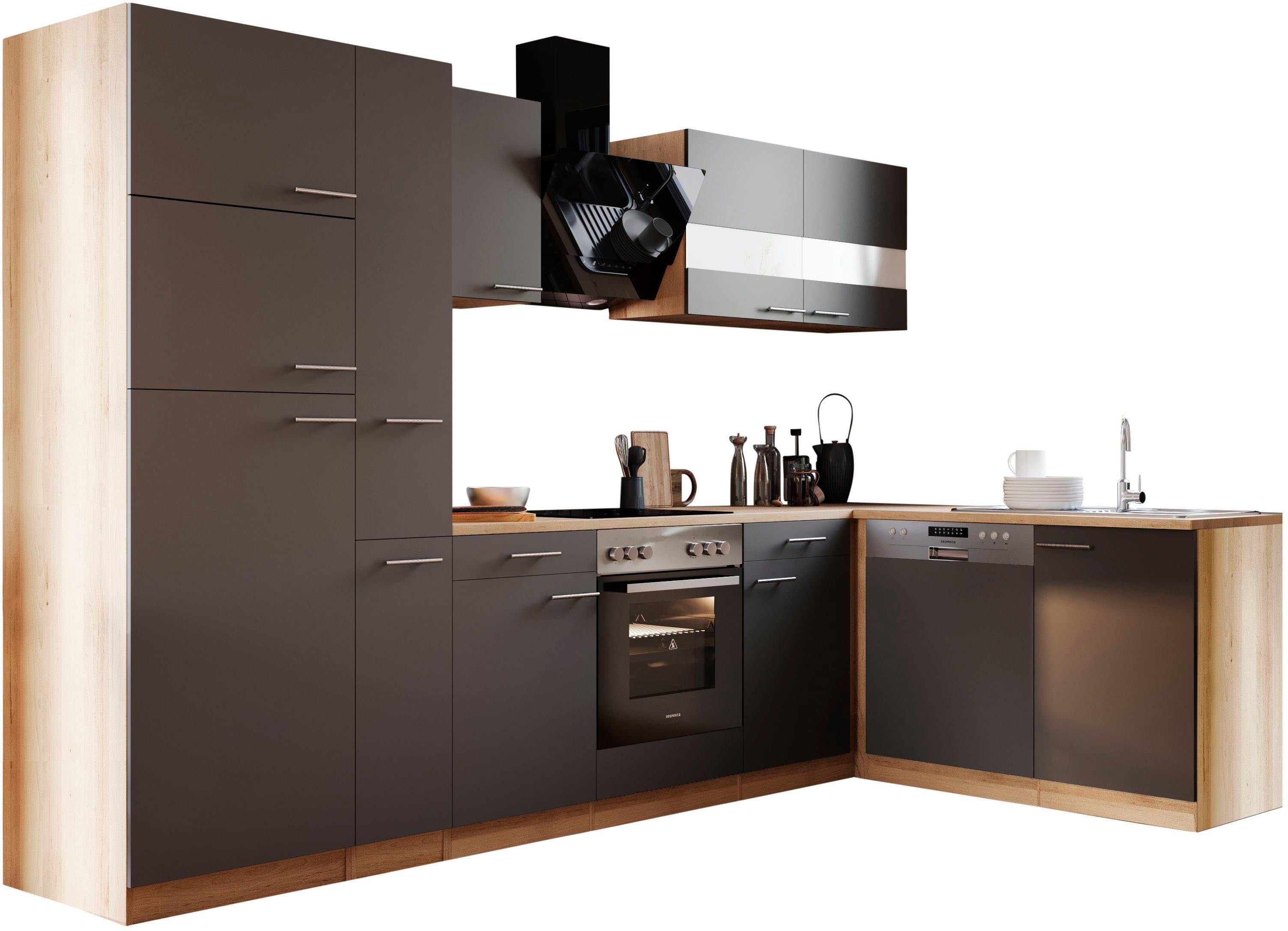 Ausstattung | Seitenverkehrt stellbar Sockelhöhe nicht verstellbar inkl. Edelstahl-Einbauspüle, mit Abtropffläche mit E-Geräten |