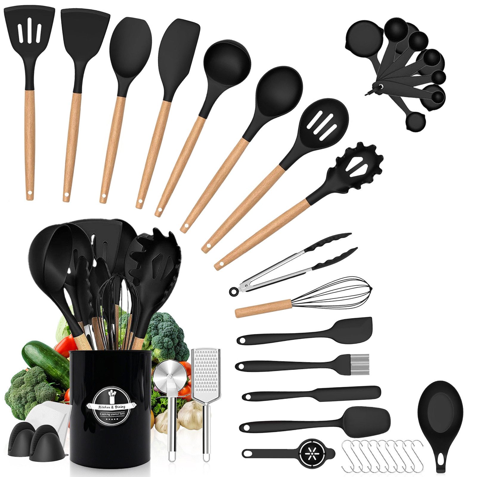 Dieses 43-teilige Küchenhelfer-Set ist die perfekte Kombination aus Funktionalität, Ästhetik und Sicherheit für Ihre moderne Küche. Die praktischen Helfer bestehen aus lebensmitteltauglichem Silikon mit stabilen Holzgriffen und sind speziell dafür entwickelt, Ihre antihaftbeschichteten Pfannen und Töpfe zu schonen.
