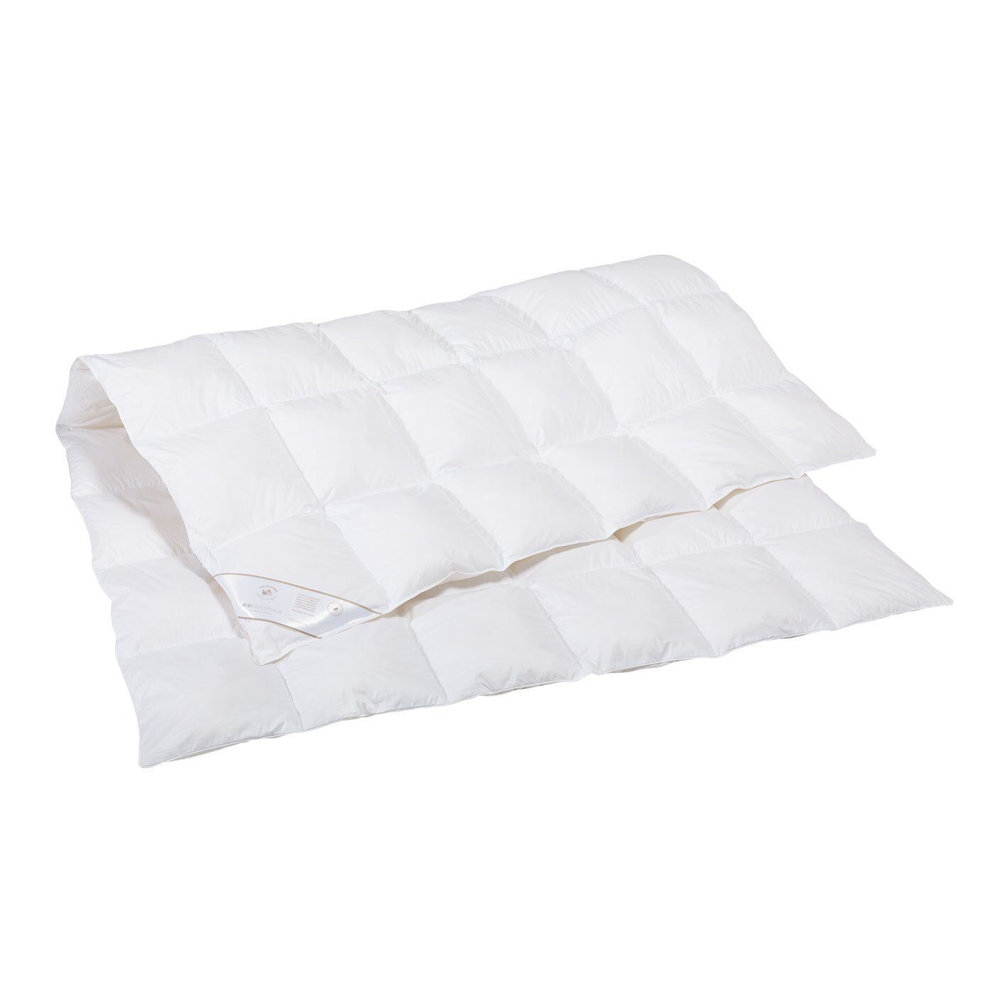 Sorgfältig ausgewählte, großflockige Qualitätsdaunen der Daunendecke "Holsteiner Weidegans" medium sorgen für wunderbare Leichtigkeit bei idealer moderater Wärmeleistung. Die Daunen stammen von einem Familienbetrieb in Norden von Schleswig-Holstein, wo die Gänse in traditioneller und tiergerechter Freilandhaltung auf Wiesen gehalten werden. Die Anzahl der Tiere ist bei den Familienbetrieben limitiert, um eine tiergerechte Haltung zu gewährleisten. Das sorgfältige Herstellungsverfahren in handwerklicher Atelierfertigung macht jede einzelne Daunendecke zu einem Meisterwerk. Ein Karosystem sorgt für die gleichmäßige Verteilung der Daunenfüllung, wodurch die Daunenfüllung immer im Karo fixiert bleibt. Bezogen mit einem feinfädigen und weichen Edelbatist aus sehr feinen Baumwollgarnen. Durch den Einsatz feiner Garnnummern und das Weben mit hoher Fadendichte entsteht ein daunendichtes Gewebe, das sich durch einen sehr weichen Griff und eine edle Optik auszeichnet.