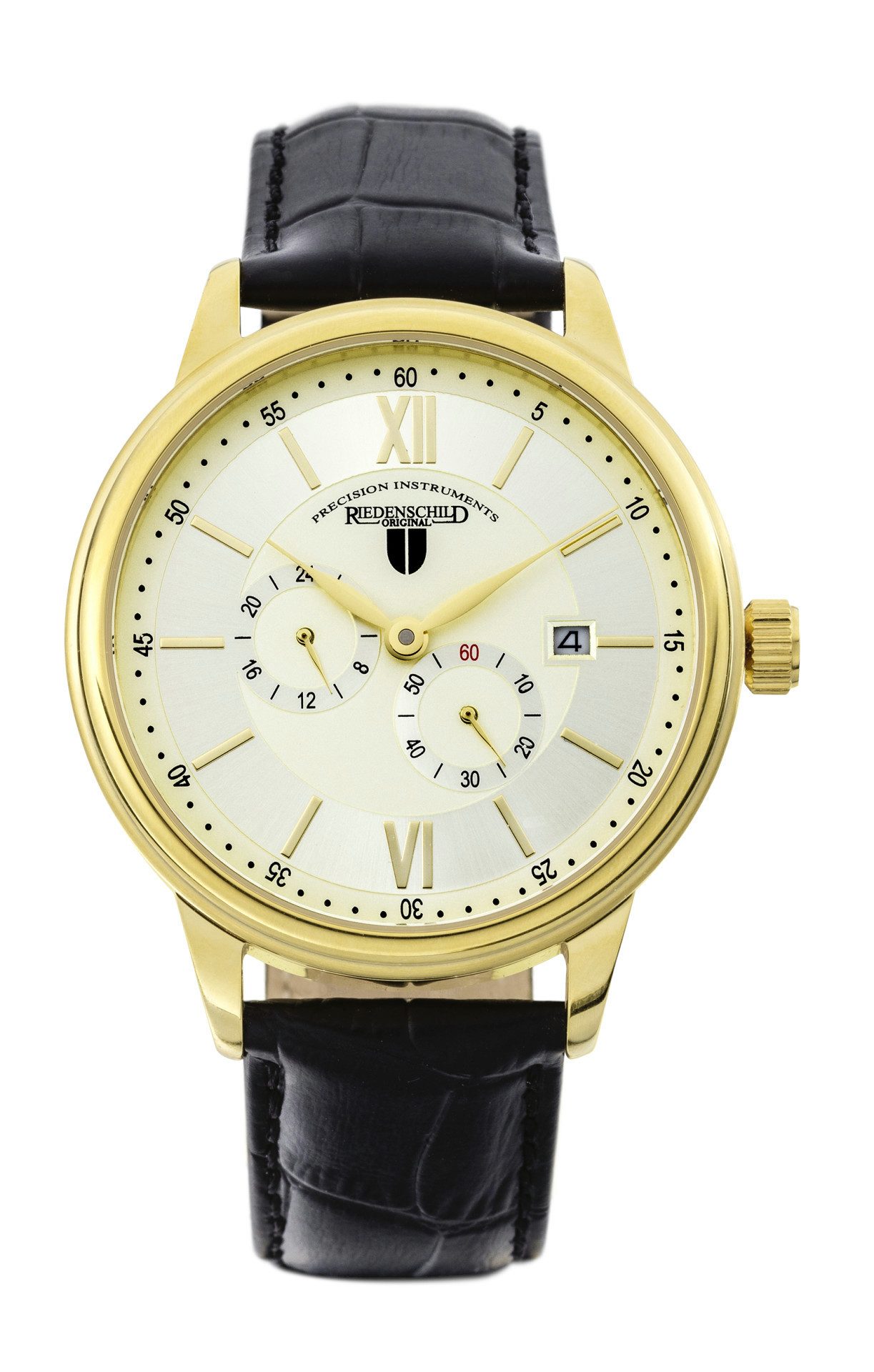 Riedenschild Automatikuhr RS7606-03, 42 mm – Vergoldete Herrenuhr mit braunem Lederband, Klassisch-elegante Automatikuhr mit Sichtboden