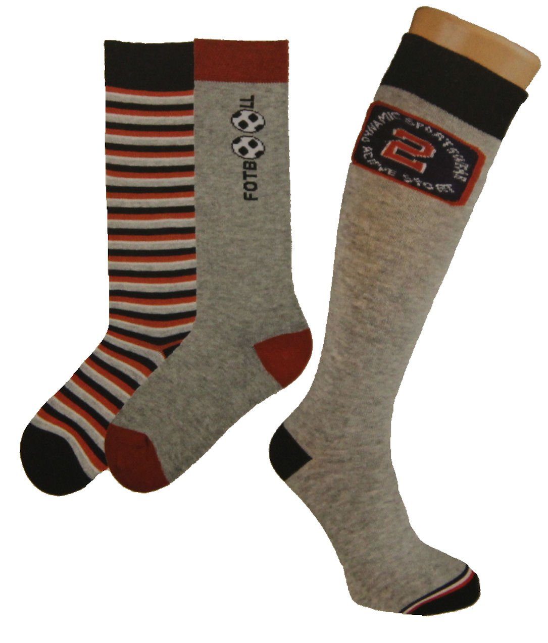 3er Pack Riese Strümpfe Kniestrümpfe flache Naht an der Fußspitze, Belastungszonen verstärkt, kein Druck im Abschlußrand, 78% Baumwolle, 19% Polyamid, 3% Elasthan Pflegehinweis: 40° Feinwäsche Modellnummer: RS-11974 Grau mit Fußball Grau gestreift Grau mit Sportabzeichen