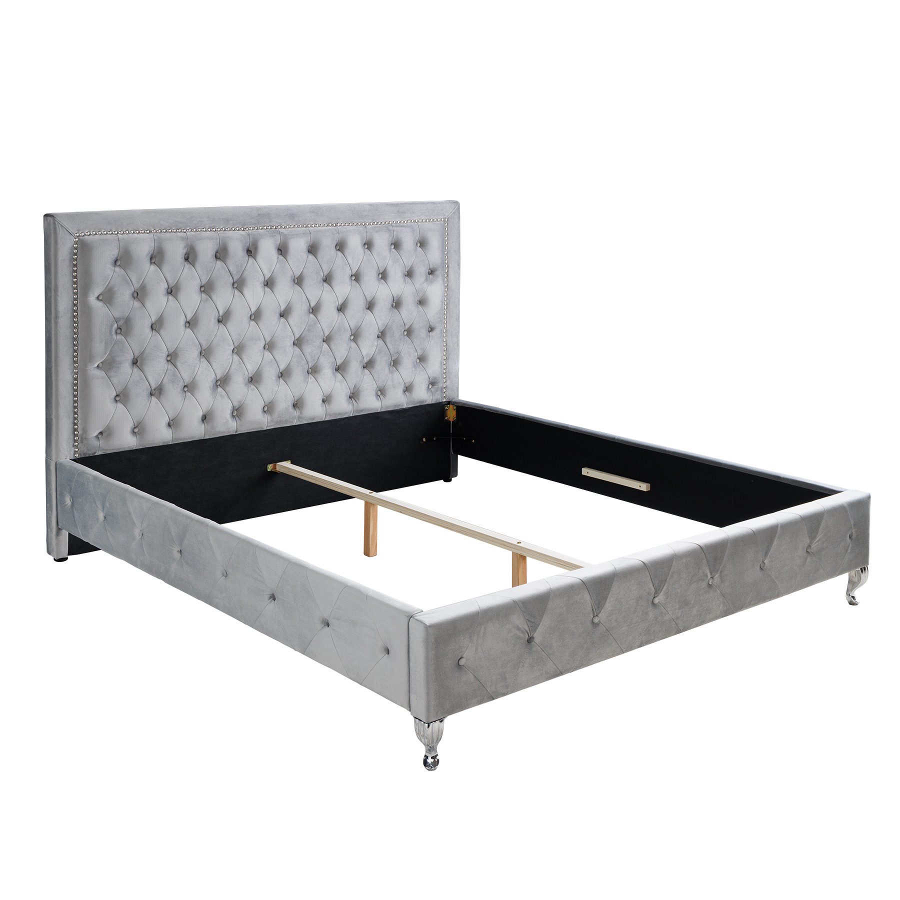 Das Gestell in seiner außergewöhnlichen und eleganten Form ist mit hochwertigem und silber schimmerndem Samt bezogen. So erhält das Polsterbett ein besonders extravagantes Design. Vollendung findet es in den zahlreichen Nieten, die in mühevoller Handarbeit um die Lehne herum platziert worden sind. Auch die geschwungenen Füße in glänzendem Metall runden das Design ab. Gönnen Sie sich einen königlich guten Schlaf in diesem extravaganten Doppelbett!