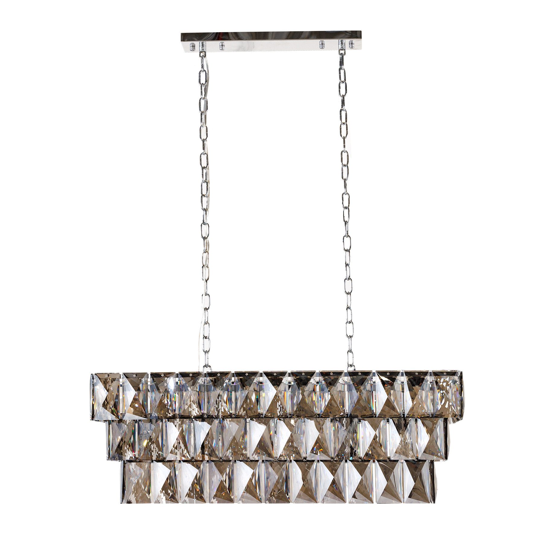 Die moderne Hängeleuchte KRISTALL vereint Luxus, Eleganz und Design in Perfektion. Dank seiner perfekt proportionierten Silhouette, die durch drei sich verjüngenden Etagen entsteht, ist der Kronleuchter ein echtes Highlight in Deinem Esszimmer. Die einzelnen Glaselemente aus grau gefärbtem Glas begeistern mit einem ausgesprochen detaillierten, prismatischen Facettenschliff und unterstreichen das luxuriöse Design der Lampe.