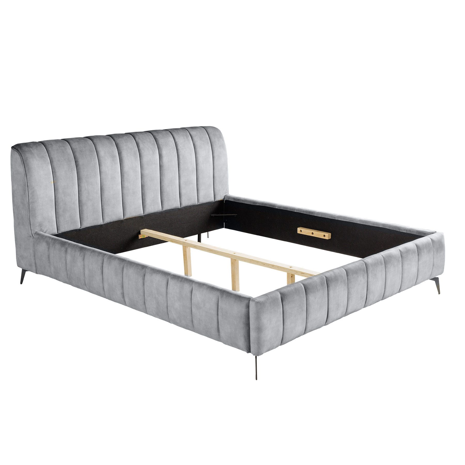 Dieses Polsterbett in elegantem Grau vereint gekonnt Design und Komfort: Während das gesamte Bettgestell mit einem strukturierten Samtbezug bezogen und zusätzlich versteppt ist, sorgen die hochwertigen Metallbeine in Schwarz für einen stabilen Stand. Die geradlinigen Nähte verleihen dem Rahmenbett einen modernen Stil, während der Stoff und die schlichte Farbe alle Kombinationsmöglichkeiten offen lassen.