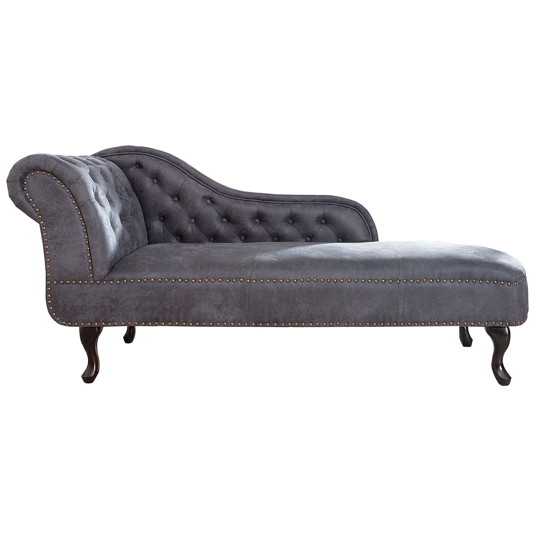 Diese klassische Chesterfield Récamière Sie begeistern! Der schöne Bezug ist aus hochwertigem Polyester in dezentem grau hergestellt und verspricht eine angenehme Haptik. Typisch für diese Récamière ist die gebogene Armlehne, die mit Knöpfen verzierte Lehnenfläche sowie der Nietenbesatz und die wunderschönen, dunklen, geschwungenen Beine.