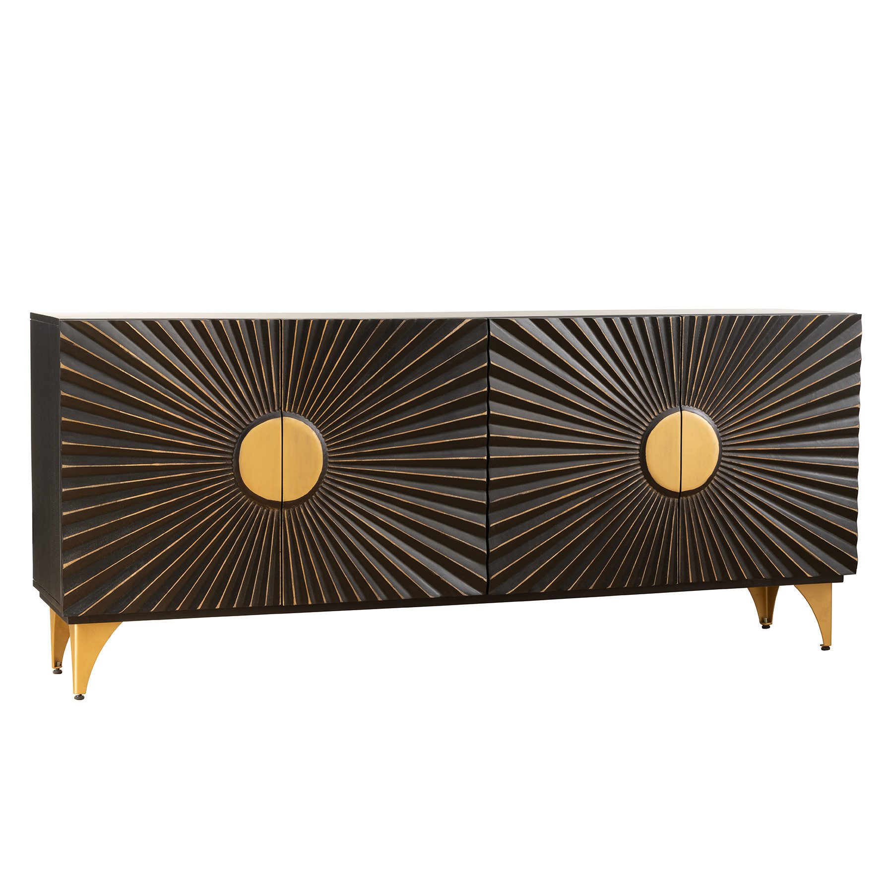 Tauche ein in zeitlose Eleganz mit unserem massiven Sideboard. Dieses beeindruckende Möbelstück ist ein funktionaler Aufbewahrungsort und ein wahrer Blickfang in jedem Raum. Hergestellt aus hochwertigem Mangoholz, zeichnet sich dieses Sideboard durch seine langlebige Qualität und seine natürliche Schönheit aus. Das markante Schwarz-Gold-Finish verleiht ihm eine luxuriöse Note und lässt das Ornament auf den Tür-Fronten strahlen.