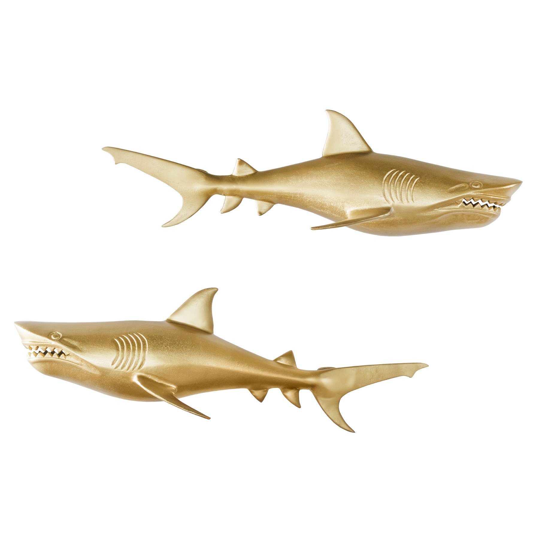 Mit der Wanddekoration HAIE ziehen echte Schmuckstücke bei Dir ein! Die Wanddekorationen in Gold bestechen mit detailgetreuem Design und glänzender Oberfläche. Dank der hochwertigen Metall-Aluminium-Legierung sind die maritimen Wohnaccessoires zum Aufhängen besonders massiv und werden zum plastischen Highlight in Deinem Wohnraum. Hol Dir die Meeresstimmung ganz einfach nach Hause und platziere die Haifisch-Skulpturen über dem passenden Sideboard oder in Deinem maritimen Esszimmer!