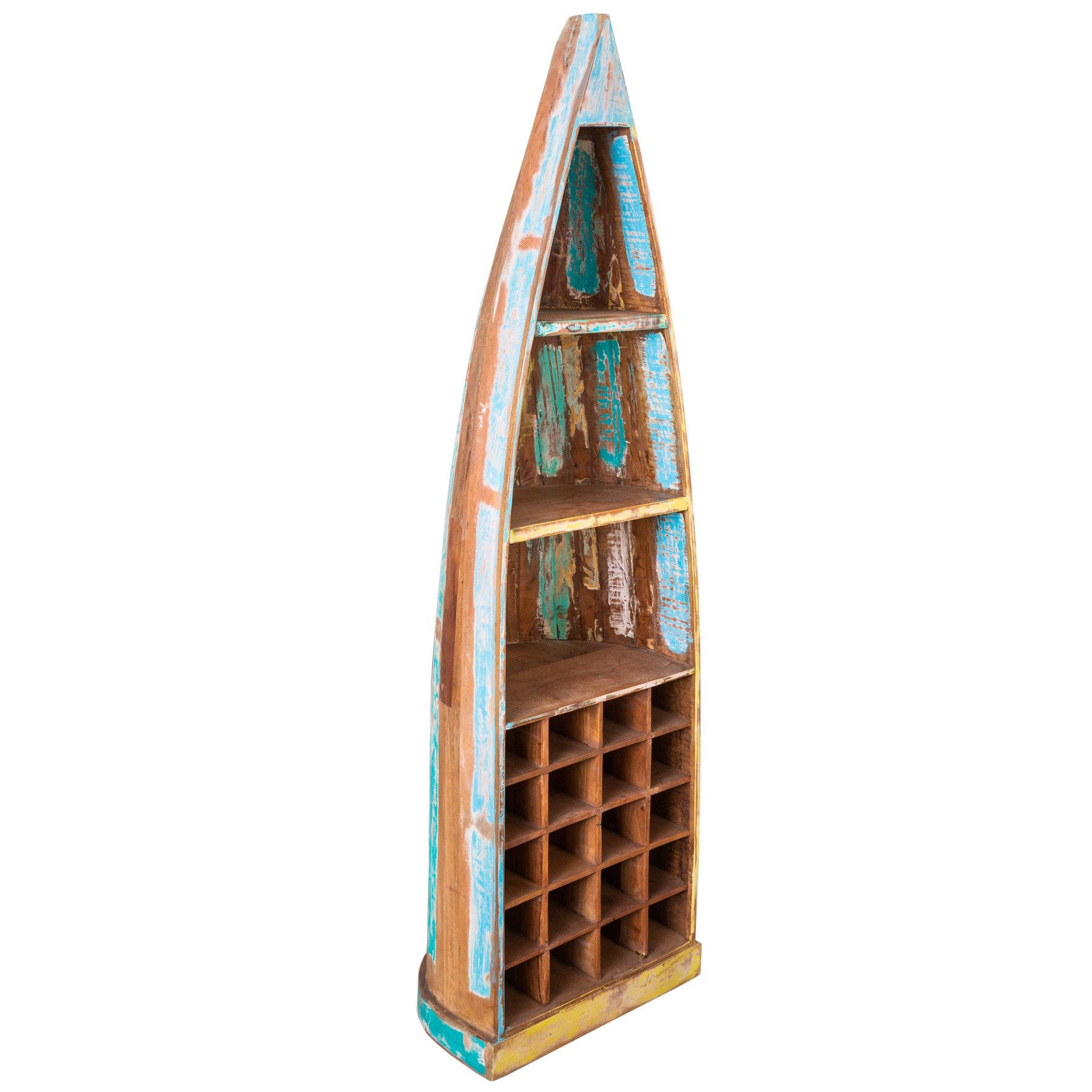 Mit unserem freistehenden Regal JAKARTA bekommst du einen wahren Blickfang in deinen Wohnraum. In Form eines traditionellen Fischerbootes findet dieses schöne Wohnregal vielseitige Verwendung im eigenen Heim. Als klassisches Wohnelement bietet das offene Regal nicht nur Platz für Vasen, Bilder und Bücher, sondern auch für 20 Weinflaschen im unteren Bereich.