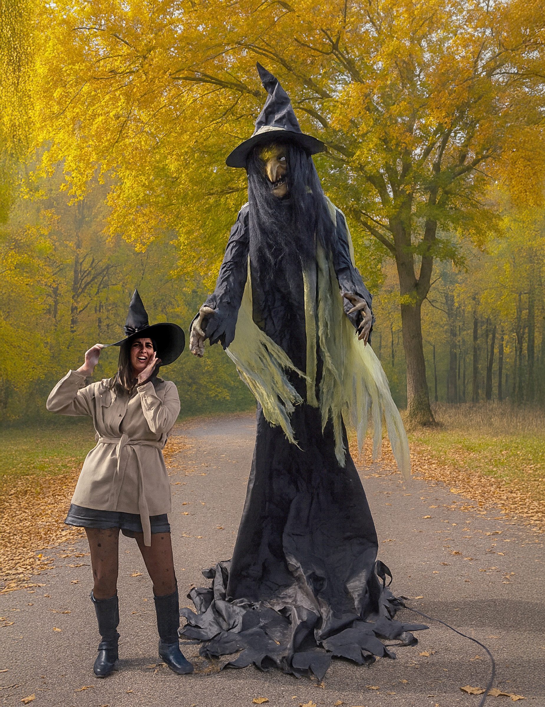 Diese animierte, gigantische Hexe (300 cm) ist das beeindruckendste Element in Ihrer Halloween-Dekoration. Mit einer Höhe von 3 Metern, einem langen schwarzen Kleid und einem spitzen Hut zieht sie alle Blicke auf sich und verbreitet eine düstere Atmosphäre. Sobald sie eine Bewegung registriert, wird sie aktiviert: Ihre Augen beginnen zu leuchten, ihr Kopf dreht sich langsam von Seite zu Seite, und sie spricht mit einer unheimlich grinsenden Stimme, begleitet von unheilvollen Krähenrufen. Eine vollständige Animation sorgt für einen packenden Effekt. Die Hexe wird über ein Netzteil betrieben und ist perfekt geeignet, um Ihre Halloween-Szenerie zu einem unvergesslichen Erlebnis zu machen.