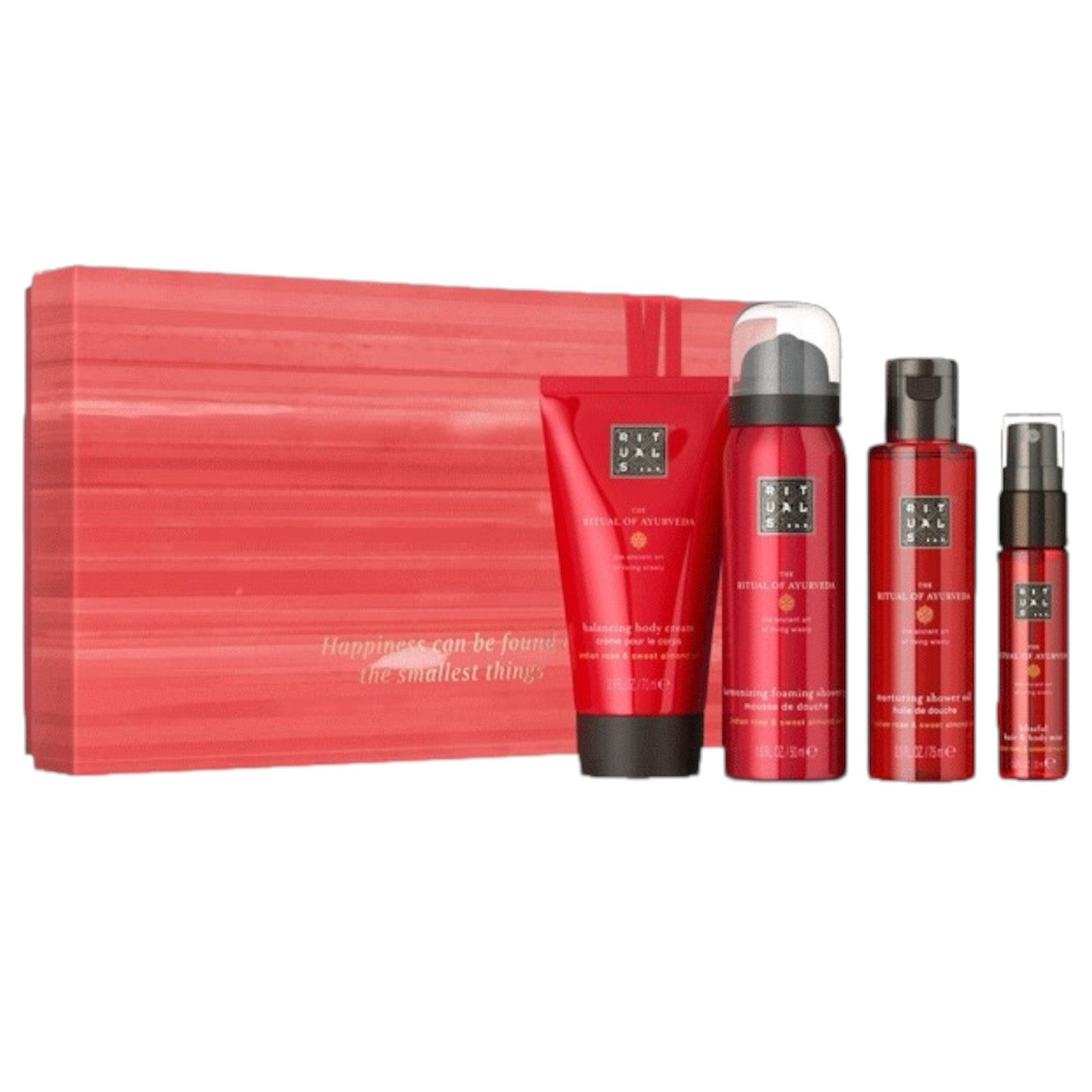 Lieferumfang | 1 X The Ritual of Ayurveda Hair & Body Mist 20 ml 1 X The Ritual of Ayurveda Body Cream 70ml 1 X The Ritual of Ayurveda Foaming Shower Gel 50ml 1 X The Ritual of Ayurveda Shower Oil 75ml |