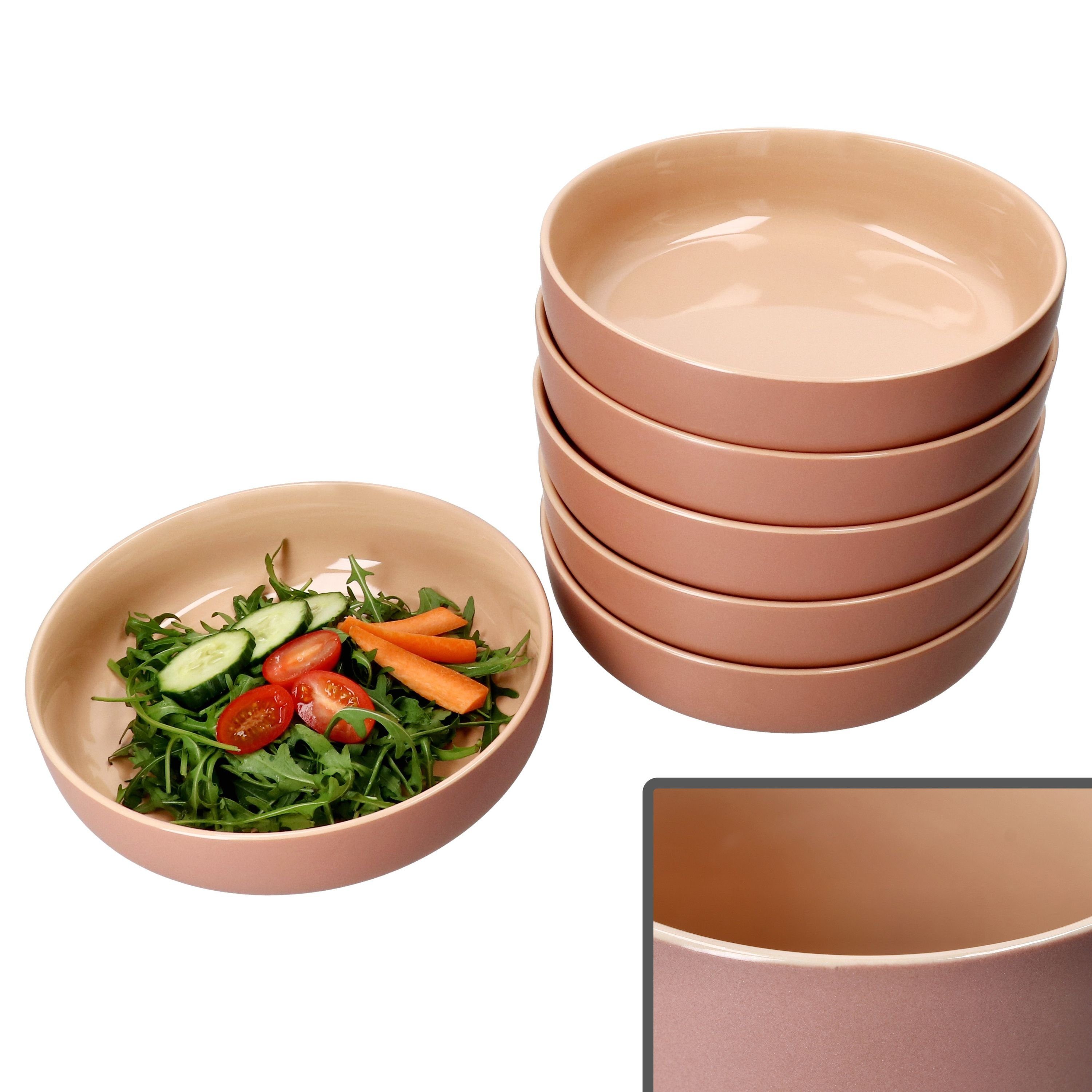 Die tiefen Teller überzeugen durch das weiche und moderne Design, welches durch die hübsche Form- und Farbgebung für eine wohlige Atmosphäre auf Ihrem Esstisch sorgt. Das Besondere an den Tellern ist die Glasur, da sie außen eine Mattglasur und innen eine Glanzglasur aufweisen. Die äußere leicht angeraute Oberfläche hat eine Soft-Touch-Haptik, die für einen einzigartigen Look sorgt. Zudem setzt sich die etwas hellere Farbnuance auf der Innenseite von der dunkleren Außenseite etwas ab und erzeugt so ein hübsches Farbspiel. Das Ganze wird abgerundet durch den stark aufsteigenden Rand.