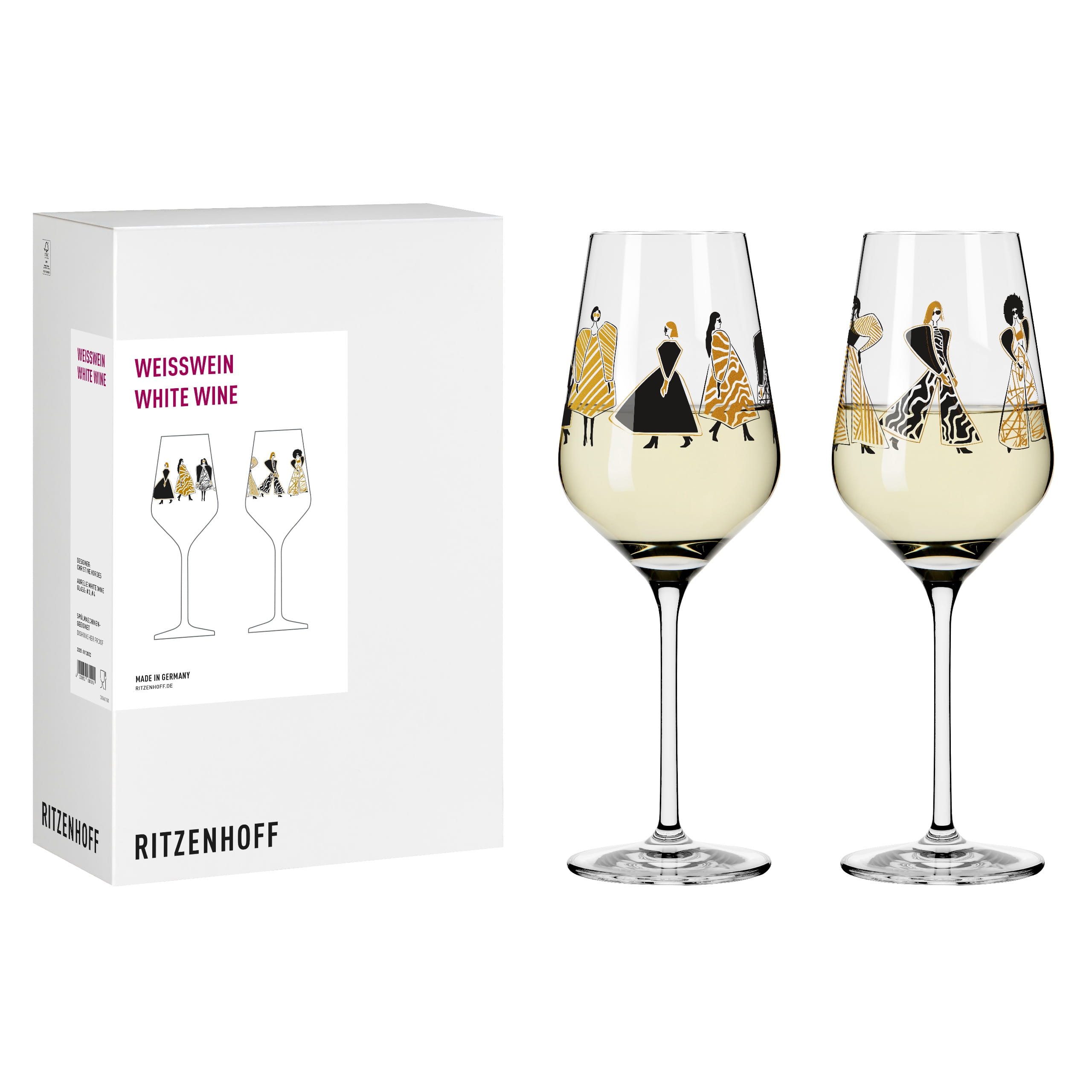 Die schlanken Gläser sind mit kunstvollen Silhouetten von Models in opulenten Kleidern in Schwarz und Gold verziert – ein Design, das an große Modenschauen und rauschende Ballnächte erinnert. Ihre Form unterstützt die optimale Entfaltung der Aromen und sorgt für einen frischen, aromatischen Weißweingenuss.