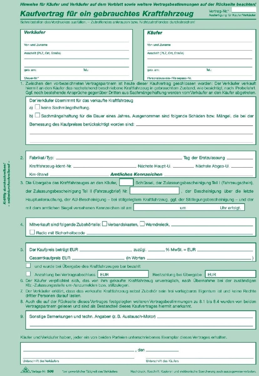 • 1. Blatt: Deckblatt, 2. Blatt: Käufer, 3. Blatt: Verkäufer, 4. Blatt: Kfz.-Zulassungsstelle, 5. Blatt: Haftpflichtversicherer, 6. Blatt: Leuchtplakat