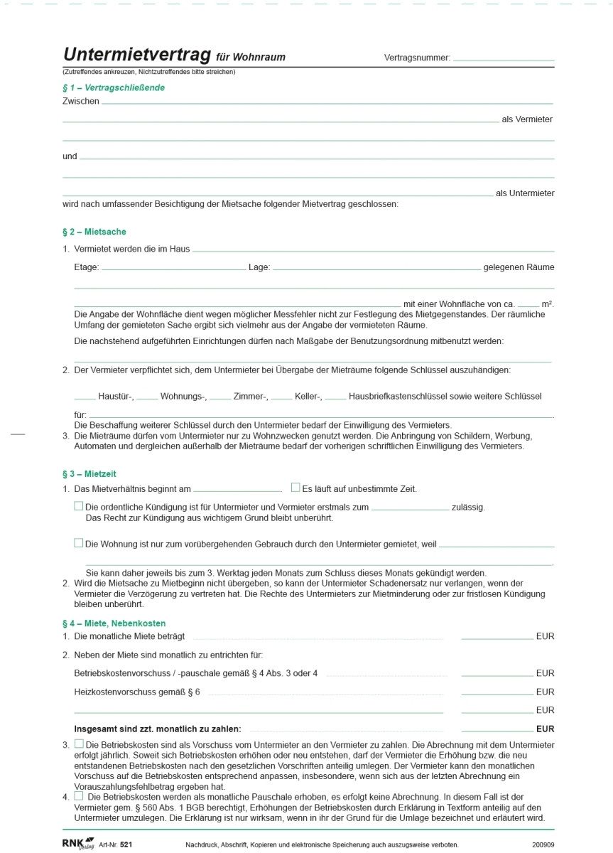 RNK Verlag Formularblock Untermietvertrag für Wohnräume SD 2x2 Blatt A4 (25 Stück)