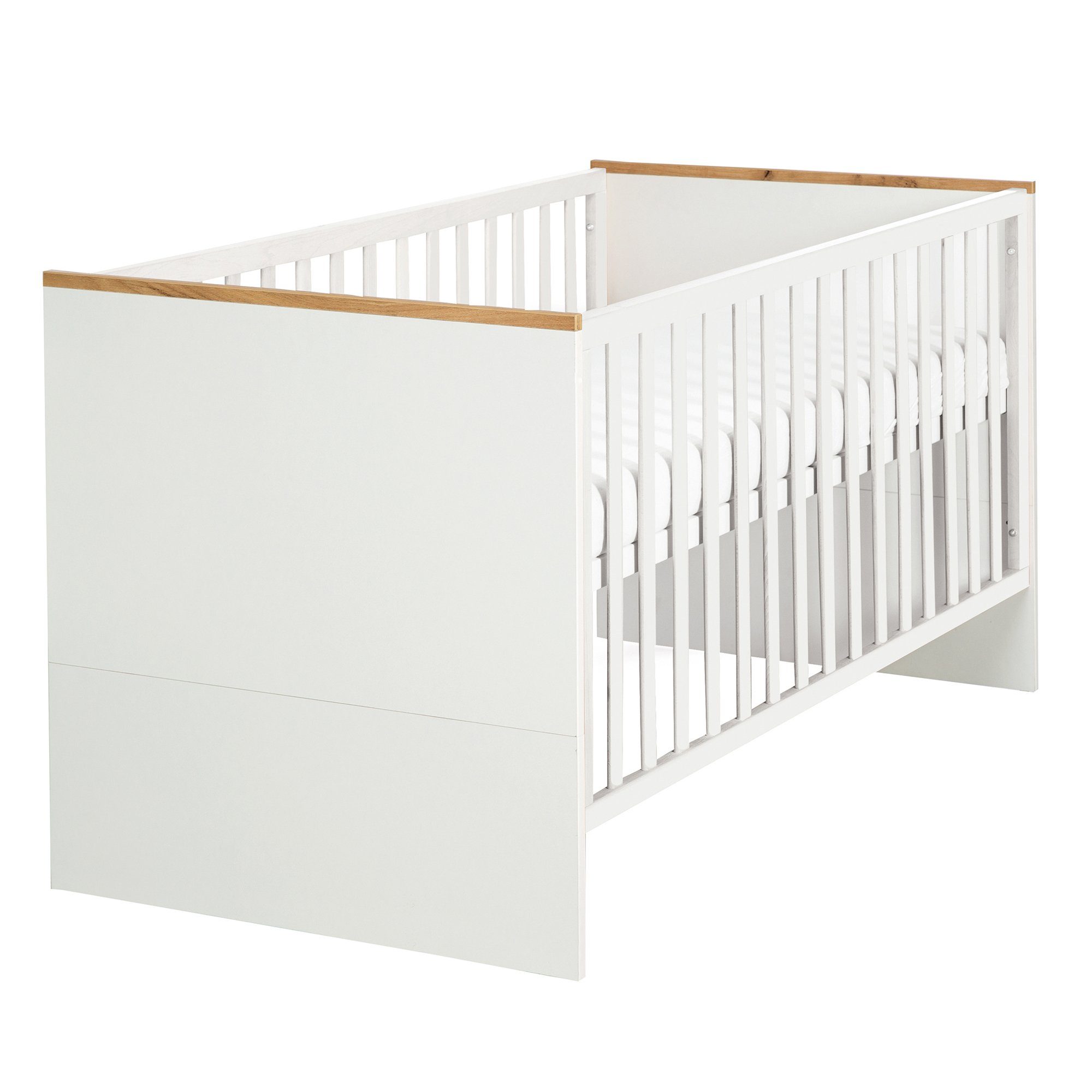 Das roba Kombi-Kinderbett 'Finn' ist mit seiner stilvollen zweifarbigen Optik im Dekor 'Goldeiche' und Weiß das Highlight im Baby- oder Kinderzimmer. Das mitwachsende Kinder- und Babybett begleitet Ihr Baby von Geburt an bis es in die Schule kommt. Als besonders rückenschonend für Sie als Eltern erweist sich die obere Liegeposition des 3-fach höhenverstellbaren Gitterbetts. Aus dieser angenehmen Liegehöhe können Sie ihr Baby mühelos aus dem Bettchen heben. Später ist die mittlere Position die perfekte Wahl, denn mittels der 3 herausnehmbaren Schlupfsprossen im Gitterelement des Babybetts ermöglichen Sie Ihrem Kleinkind den sicheren Ein- und Ausstieg. Die unterste Position des höhenverstellbaren Kinderbetts ist für das Juniorbett vorgesehen. Ist ihr Baby dann größer, lässt sich das Kombi-Kinderbett mit den mit separat erhältlichen Umbauseiten (Art. Nr. 10011WE) und ein paar Handgriffen in ein Juniorbett umbauen. Kopf- und Fußteil des Kombi-Kinderbetts sind teilbar. Beim Umbau zum Juniorbett kommen die oberen beiden Hälften des Kopf- und Fußteils zum Einsatz und sorgen für einen neuen Look im Kinderzimmer. Das Kombi-Kinderbett 'Finn' findet bis zum 7. Lebensjahr Ihres Kindes (bzw. bis zu einem Körpergewicht von 50 kg) Verwendung. Das roba Kinder- und Juniorbett hat die Liegefläche 70 x 140 cm. Wenn Sie das Babybett in ein Himmelbett verwandeln möchten, bieten sich unsere 4-teiligen roba Kinderbettgarnituren bestehend aus Kissen, Decke, Himmel und Nestchen an. Das roba Kombi-Kinderbett ist in Deutschland entwickelt und entspricht den aktuellen Sicherheitsstandards nach EN 716 – 1:2017 + AC:2019. Das Gitterbett 'Finn' wurde in der EU produziert und ist montagefreundlich. Zusätzlich ist es eph zertifiziert und trägt das Qualitätssiegel blauer Engel, das garantiert, dass alle verwendeten Materialien höchste Ansprüche an Umwelt-, Gesundheits- & Gebrauchseigenschaften erfüllen. (HxBxT): 82,5 x 76 x 144 cm. Farbe weiß, Holzdekorkanten in 'Goldeiche'.