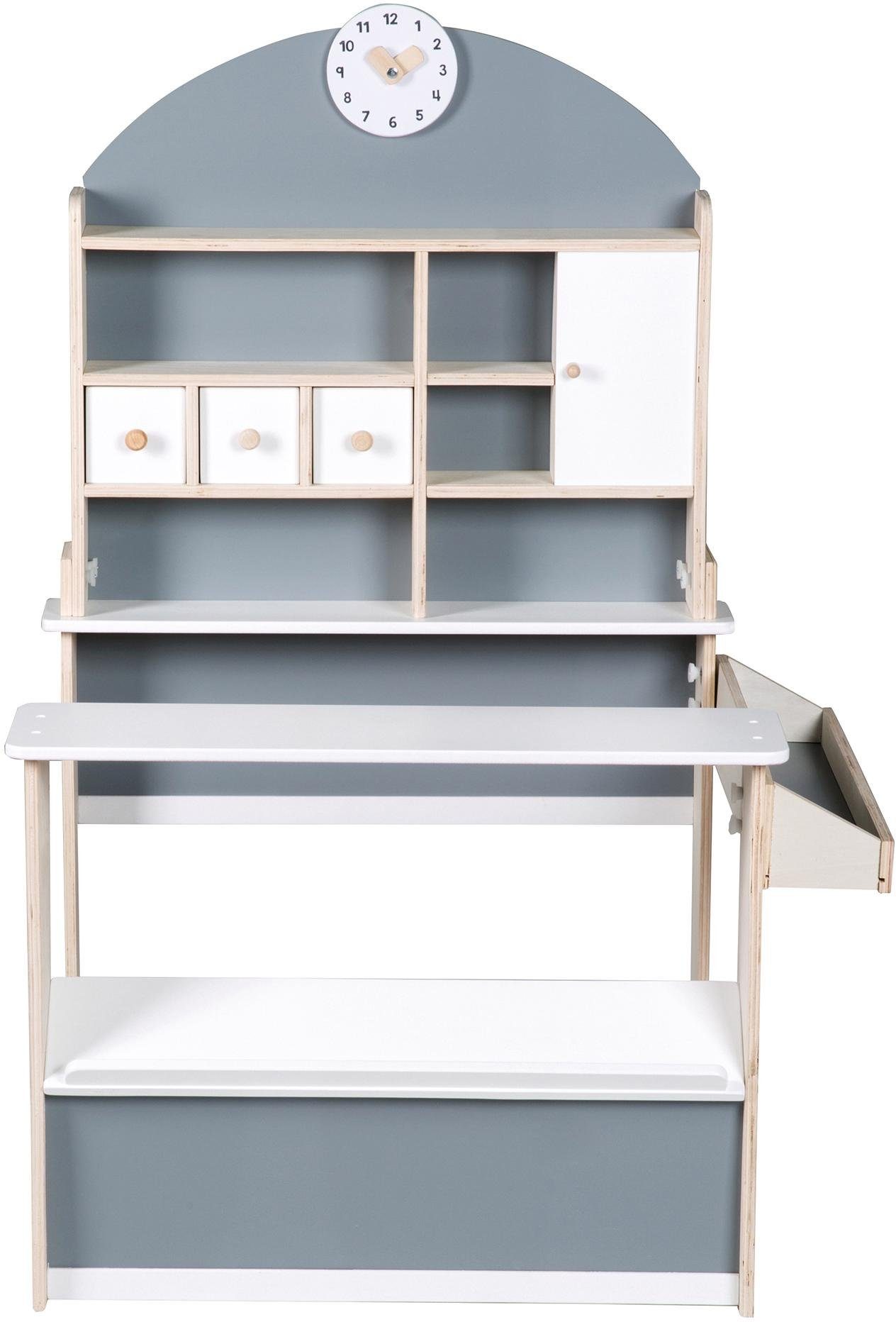 Ausstattung | Ablagen, Holzschubladen, Schiebetüre, Seitentheke, Theke, Uhr |