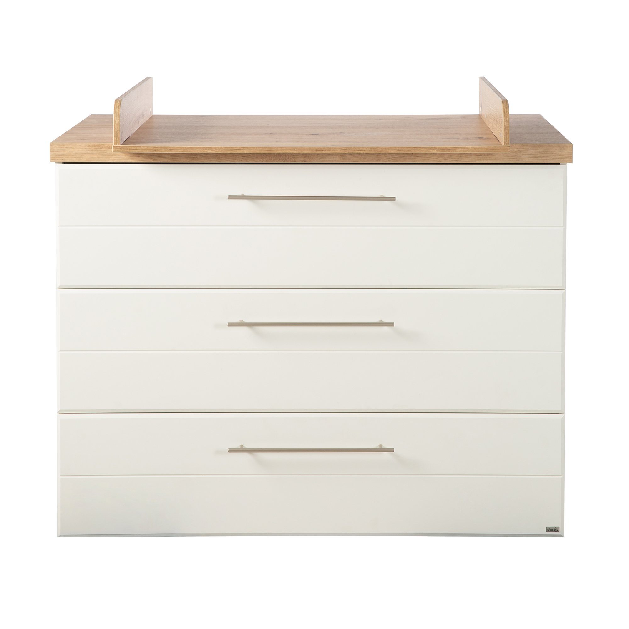 Die breite Wickelkommode hat silberfarbene Metallrelinggriffe, einen weißen Korpus und weiße Fronten mit horizontalen Fräsungen sowie einen Kranz in 'Artisan Eiche'