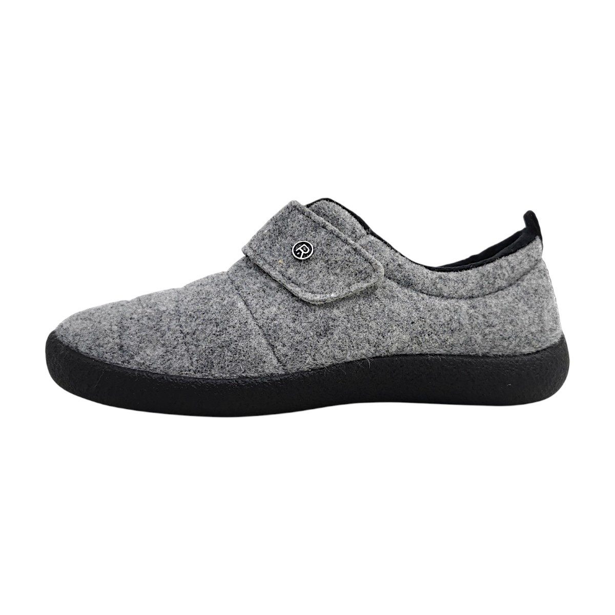 Mit dem Filz wurde ein wärmeisolierendes Obermaterial verwendet. Dank der profilierten Sohle aus Synthetik sorgen die Hausschuhe für einen guten Halt auf jedem Boden — ob Fliese oder Laminat. Die herausnehmbare Innensohle aus Filz bietet zusätzliche Flexibilität und ermöglicht die Verwendung individueller Einlagen oder orthopädischer Sohlen. Die runde Schuhspitze schafft ein angenehmes Tragegefühl und verleiht dem Schuh ein sanftes, abgerundetes Design. Diese Hausschuhe in Weite F sind für schmale bis normale Füße geeignet.