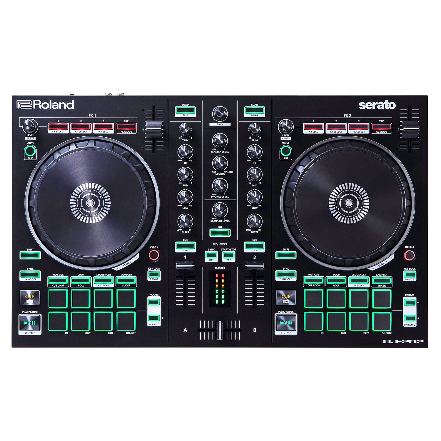 Der DJ-202 von Roland ist ein DJ Controller mit zwei Kanälen und vier Decks. Der kompakte Controller lässt sich schnell einrichten und dank der Tragegriffe gut transportieren. Durch den hochauflösenden DA-Wandler bietet der DJ-202 mit 24bit/48kHz eine hervorragende Klangqualität.