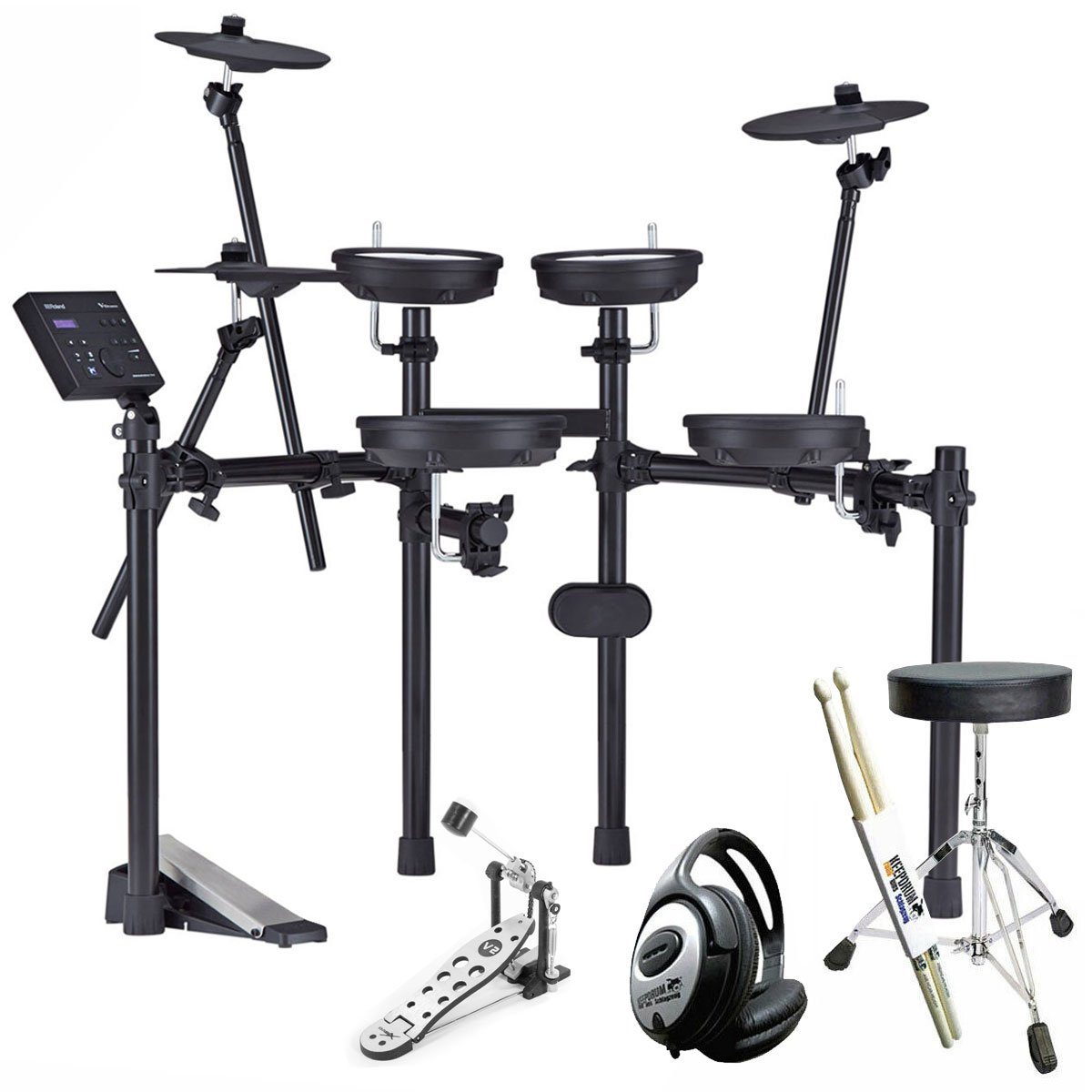 Das kompakte Setupbesteht aus einem Snare-Pad, drei Tom-Pads, einem Ride-Pad, einemCrash-Pad, einem Basssdrum-Kickpad soweie einem Hihat-Pad und einemHihat-Pedal. Das Snarepad und die Toms sind mit Mesh-Headsausgestattet und bieten dadurch ein hervorragendes Spielgefühl undReboundverhalten. Mit dabei ist zudem das leistungsstarke TD-07 DrumModul.