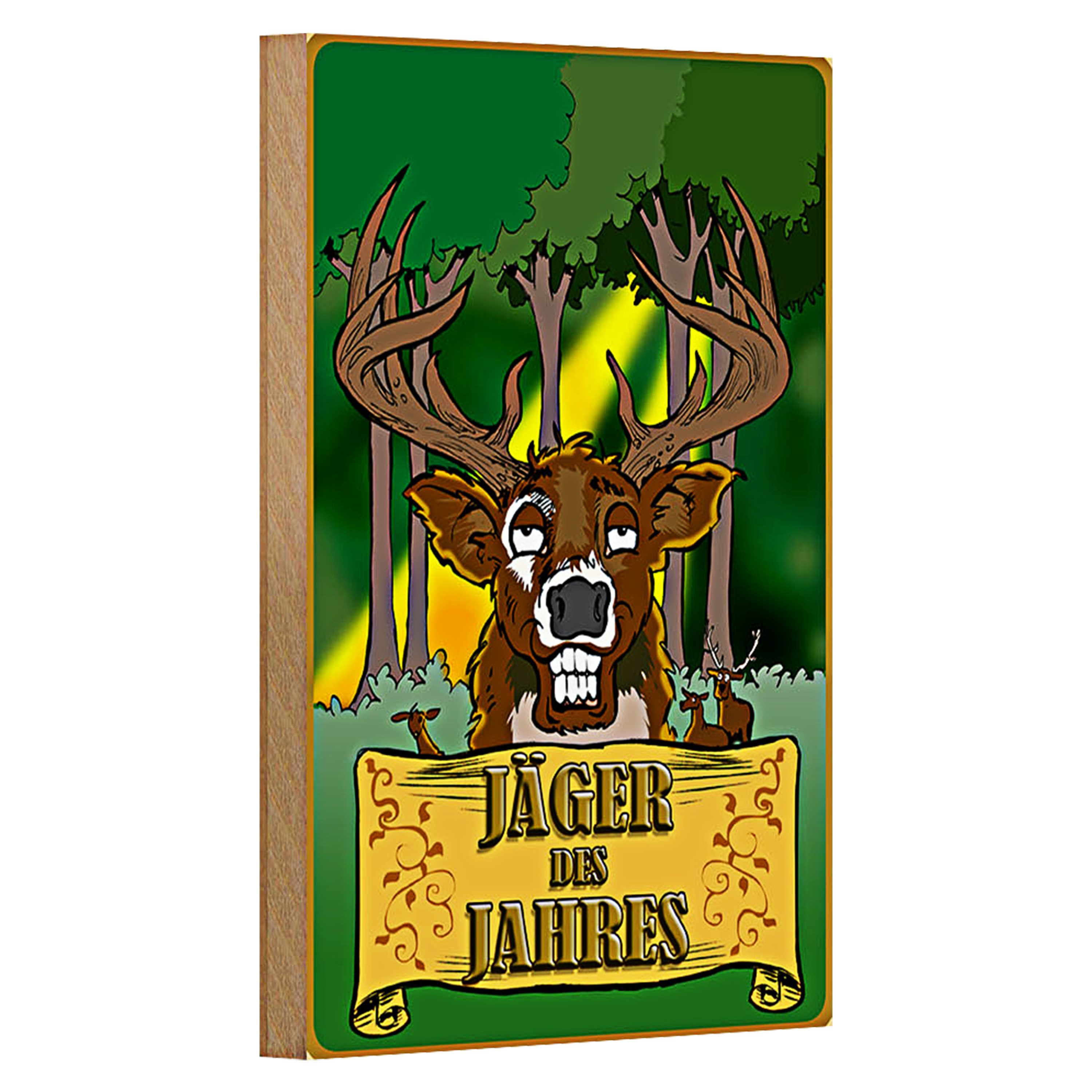 Tauchen Sie ein in die Welt der Jagd mit diesem humorvollen Holzschild, das einen überraschten Hirsch im Wald darstellt.