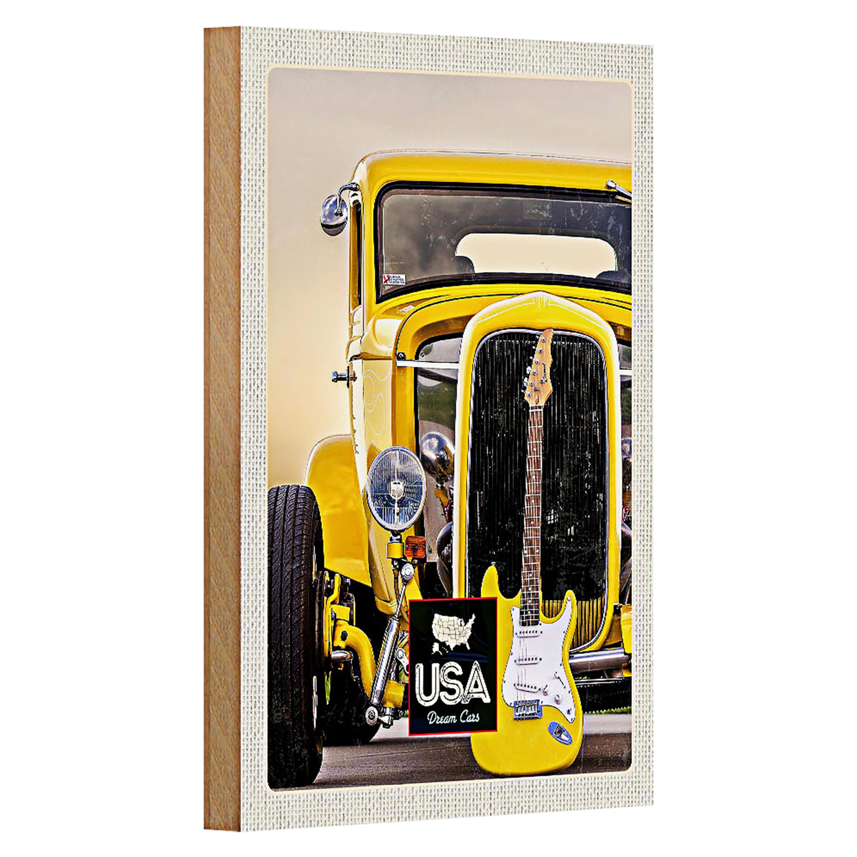 Tauchen Sie ein in die Welt der amerikanischen Träume mit diesem Holzschild Ein leuchtend gelber Oldtimer und eine E-Gitarre verkörpern den Geist der Freiheit und des Rock 'n' Rol.