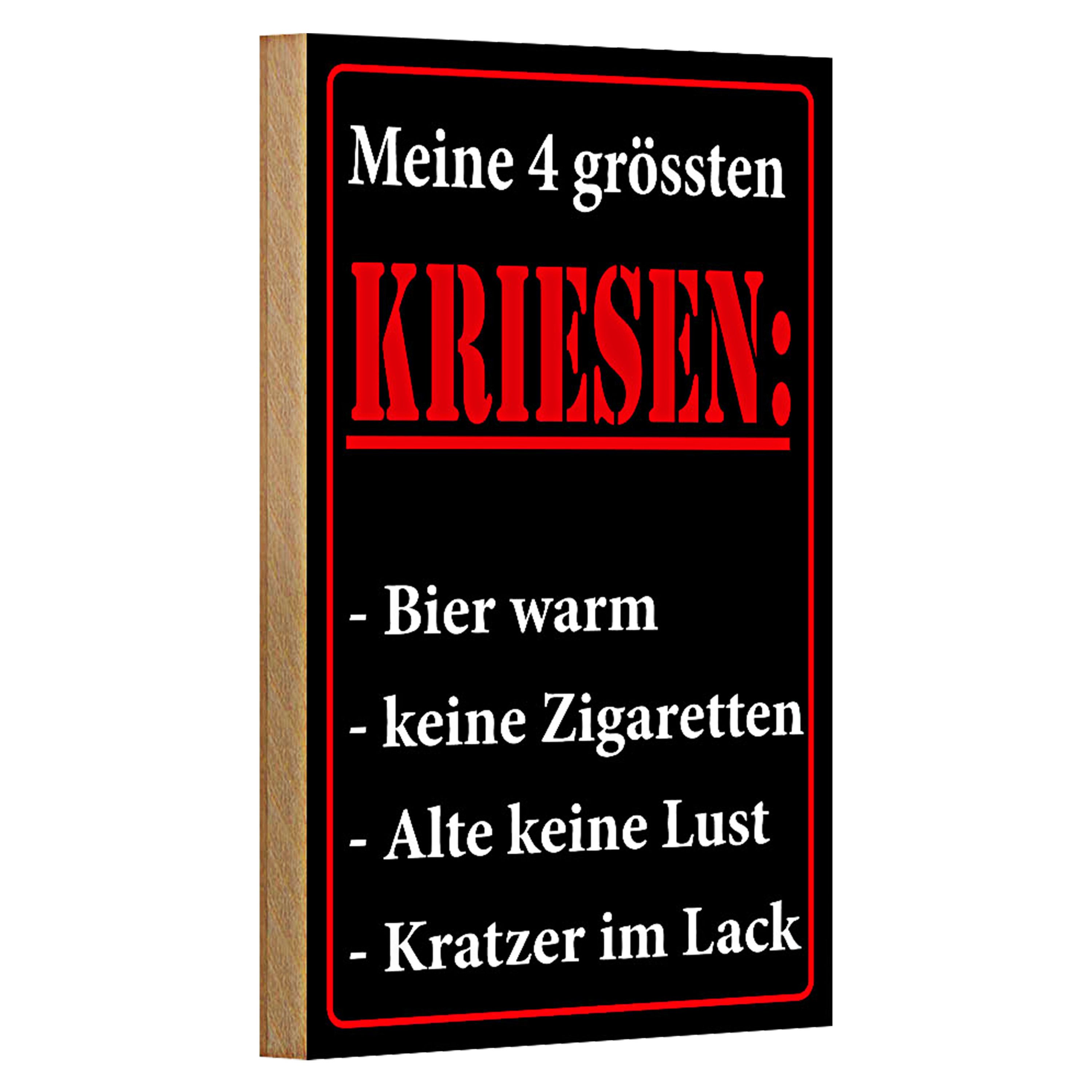 Dieses charmante Holzschild präsentiert auf humorvolle Weise die '4 größten Kriesen' eines jeden Genießers: warmes Bier, keine Zigaretten, keine Lust und Kratzer im Lack.