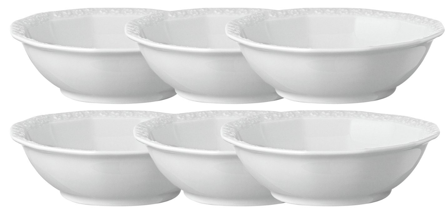 Weisse Schalen für Fleisch und Beilagen, Saucieren für Sauce und Butter, auch das Brot findet eine passende Aufbewahrung in dem Brotkorb aus Porzellan. Zusätzlich gibt es aber auch Besonderheiten, die andere Porzellane nicht bieten. Beilagenplatten, Konfektschalen oder auch Pastaschüsseln.