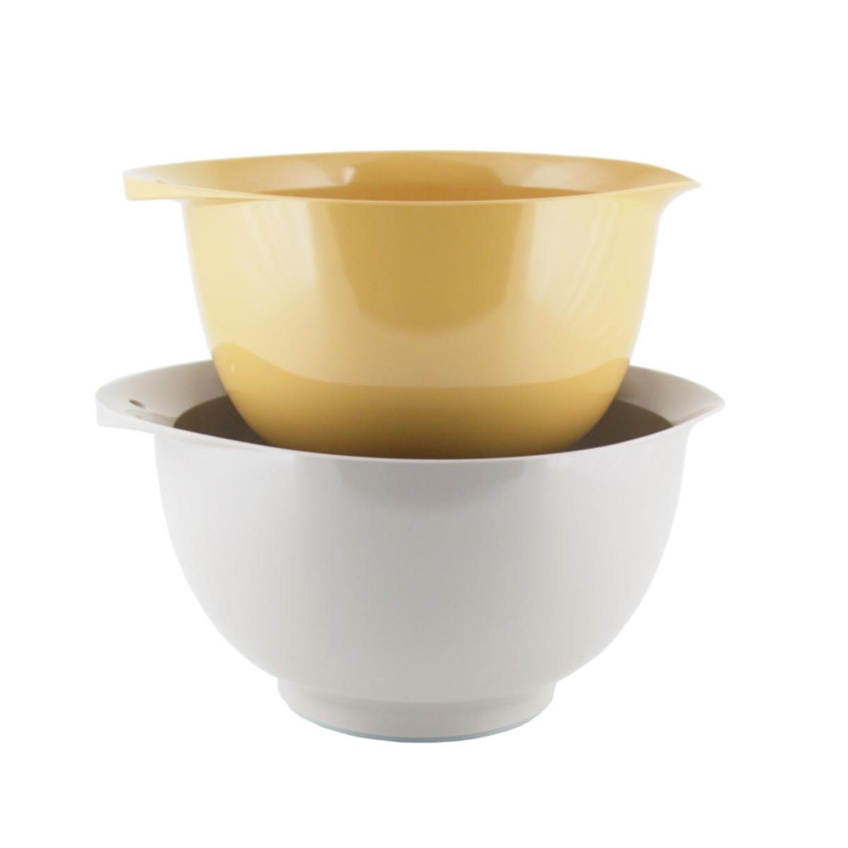 ROSTI Schüssel 2-er Set VICTORIA beach ca 2+3L Mit den ansprechenden Naturfarben 'Humus & Curry' zieht Sommerstimmung in Ihre Küche. Das höhere Gewicht und der Anti-Rutsch-Ring verleiht den neuen durchdachten Rührschüsseln von ROSTI einen stabilen Stand. Ideal zum Kochen & Backen ist auch die praktische, verstärkte Ausgießlippe und wohlgeformte, ebenso verstärkte, ergonomisch geformte Griff und das Loch im Selbigen erleichtert das Aufhängen der Schüsseln. Zwei Drainagekanäle am Boden/im Standfuß sorgen dafür, dass das Wasser beim Spülvorgang ungehindert abfließen kann. Natürlich sind sie BPA-frei. Im Lieferumfang enthalten: 1 Stück 2L Schüssel, 1 Stück 3L Schüssel by Jacob Jensen Design Material Schüsseln: Melamin Farbgebung: Humus & Curry Maße der 2er: ca.13 x24 x 20 cm (HxLxT) Maße der 3er: ca.13,5 x27,5 x 23 cm (HxLxT) Fassungsvermögen Schüsseln: 1x ca. 2 Liter, 1x ca. 3 Liter Hinweis: spülmaschinenfest - nicht mikrowellengeeignet - nicht im Gefrierschrank verwenden - BPA-frei - lebensmittelecht - kratzfest Melamin-Schüssel mit verstärkten Seiten, Ausguss und Griff | hitzebeständig bis 70 Grad | optimale Standsicherheit durch Anti-Rutsch-Ring | zwei Abflusskanäle im Fuß, sodass nach dem Waschen in der Spülmaschine kein Wasser stehen bleibt | Loch im Griff zum Aufhängen für die Aufbewahrung Dieses Angebot gilt für ein 2-er Set VICTORIA Schüsseln aus Melamin in der Farbe beach (=Humus & Curry), Fassungsvermögen 1x ca. 2L, 1x ca. 3L, Artikel RO-24838, OHNE Deko oder sonstiges Zubehör.