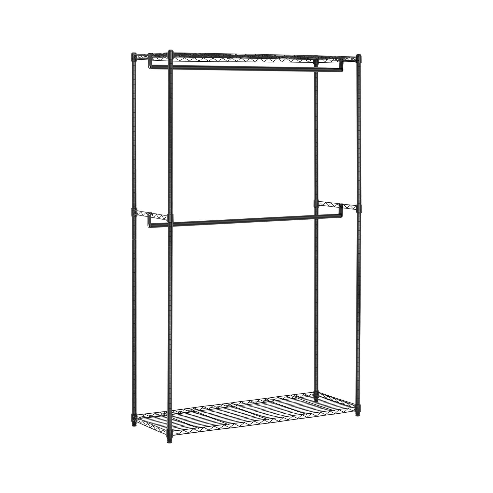 Bewahren Sie Ihre Jacken und Mäntel sowie andere Kleidungsstücke oder Taschen ordentlich in der eleganten Garderobe aus Metall auf. Zwei 120 cm lange Kleiderstangen und zwei großzügige Ablagen mit den Maßen 45 x 120 cm bieten dafür genug Stauraum. Ablageflächen wie Kleiderstangen können mit bis zu je 50 kg belastet werden; wodurch die gesamte Konstruktion der Metall Garderobe bis zu 200 kg tragen kann.