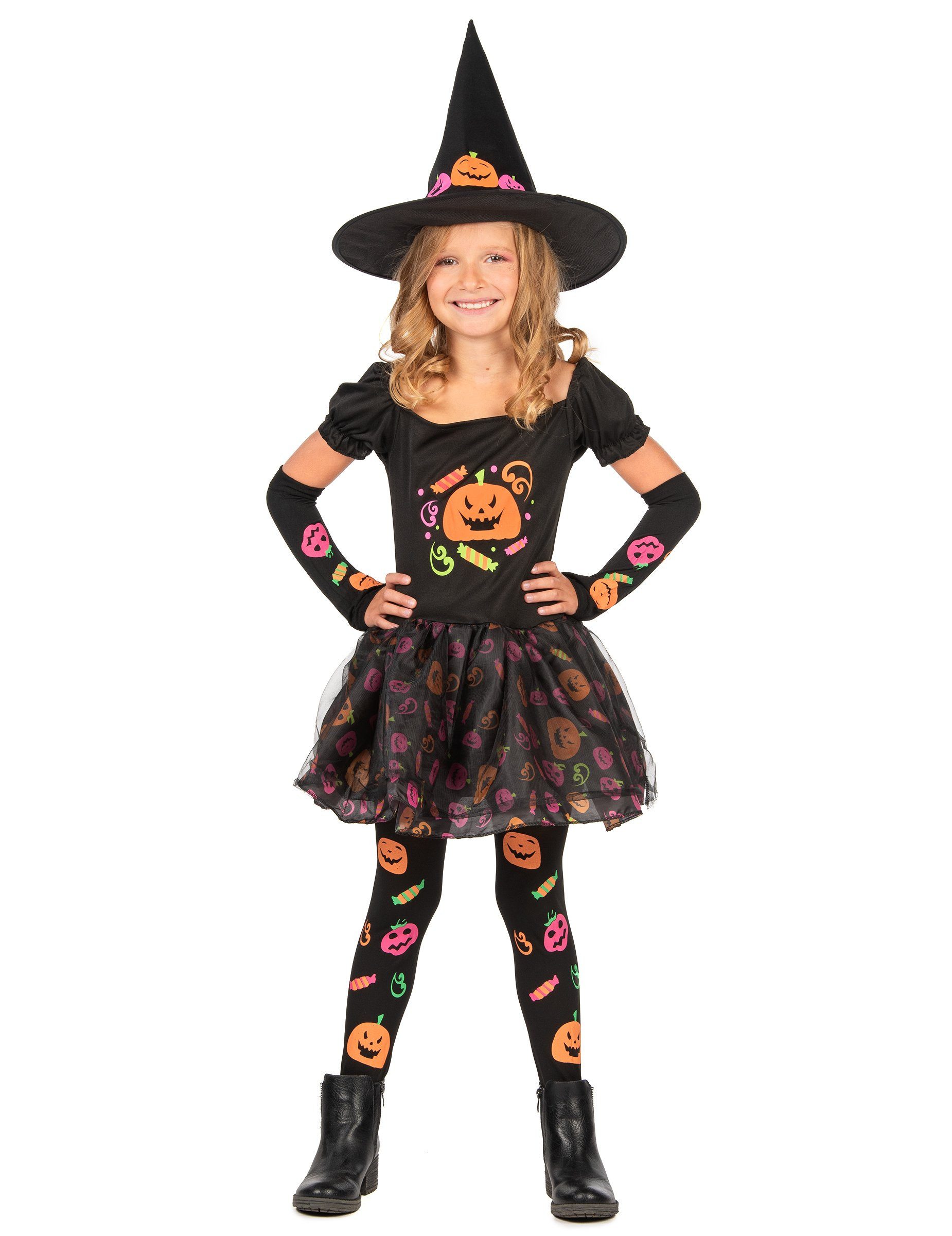 Das Kürbishexen-Kinderkostüm besteht aus einem Kleid, einer Strumpfhose, einem Hexenhut und zwei Armstulpen. Die Schuhe und der Kürbis-Eimer sind nicht dabei. Zu einer kleinen Zauberin, die an Halloween ihre Magie wirken lässt, um auf der Süßes-oder-Saures-Tour besonders viele Süßigkeiten mit nach Hause zu bringen, wird Ihr Kind mit diesem niedlichen Hexenkostüm. Das schwarze Hexenkleid ist sowohl auf dem Oberteil als auch auf dem mehrlagigen Rockteil mit Kürbissen und Süßigkeiten in bunten Farben bedruckt. Ähnlich gestaltet sind auch die Armstulpen, der Hexenhut und die Strumpfhose. Ergänzende Hexenaccessoires wie Hexenbesen finden Sie ebenfalls in unserem Меню.