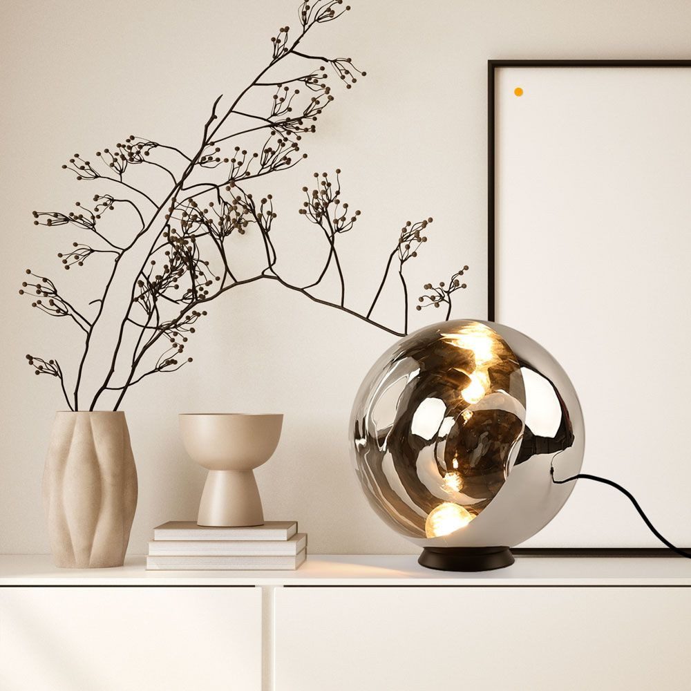 Die Orb Tischleuchte präsentiert sich mit einer einfachen Eleganz, die seinesgleichen sucht. Die Glaskugel sitzt auf einem einfachen schwarzen Metallring und kann so einfach ausgerichtet werden. Erleuchtet wird die Kugel durch eine einfache Fassung, die in der Kugel liegt und in Verbindung mit einem E27 Vintage Leuchtmittel dekorativ für eine gemütliche Atmosphäre sorgt.