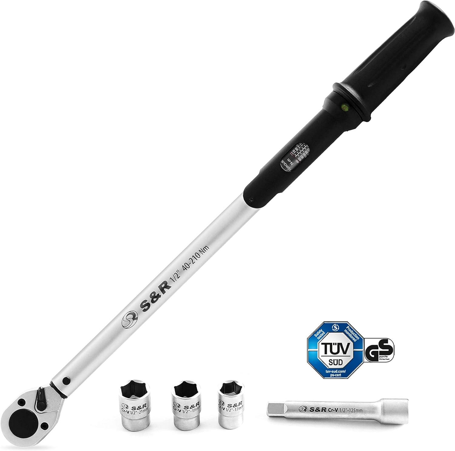 S&R Drehmomentschlüssel Set: 1/2" 560 mm 40-210 Nm mit 1/2" Verlängerung 125 mm und 3 Stecknüssen 17mm, 19mm, 21mm ; Drehmoment-Schlüssel Bruchfest, mattiert, Profi QUALITÄT