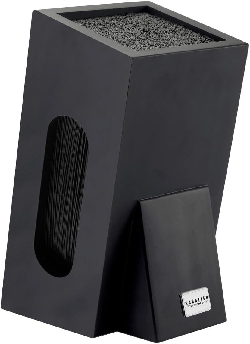Der Sabatier Trompete Universalmesserblock bietet eine kompakte und stilvolle Möglichkeit, Ihre Küchenmesser sicher aufzubewahren – ohne enthaltene Messer. Mit seiner eleganten Holzoptik und den flexiblen schwarzen Stäben aus der Universal Block Collection sorgt er für eine geordnete Aufbewahrung und schont gleichzeitig die empfindlichen Messerklingen. Der Block eignet sich für bis zu fünf Küchenmesser unterschiedlicher Размер und hält sie jederzeit griffbereit. Durch die spülmaschinenfesten Materialien lässt sich der Messerblock besonders leicht reinigen und überzeugt mit seiner robusten Verarbeitung. Ideal für alle, die ihre vorhandenen Messer sicher und ansprechend unterbringen möchten.