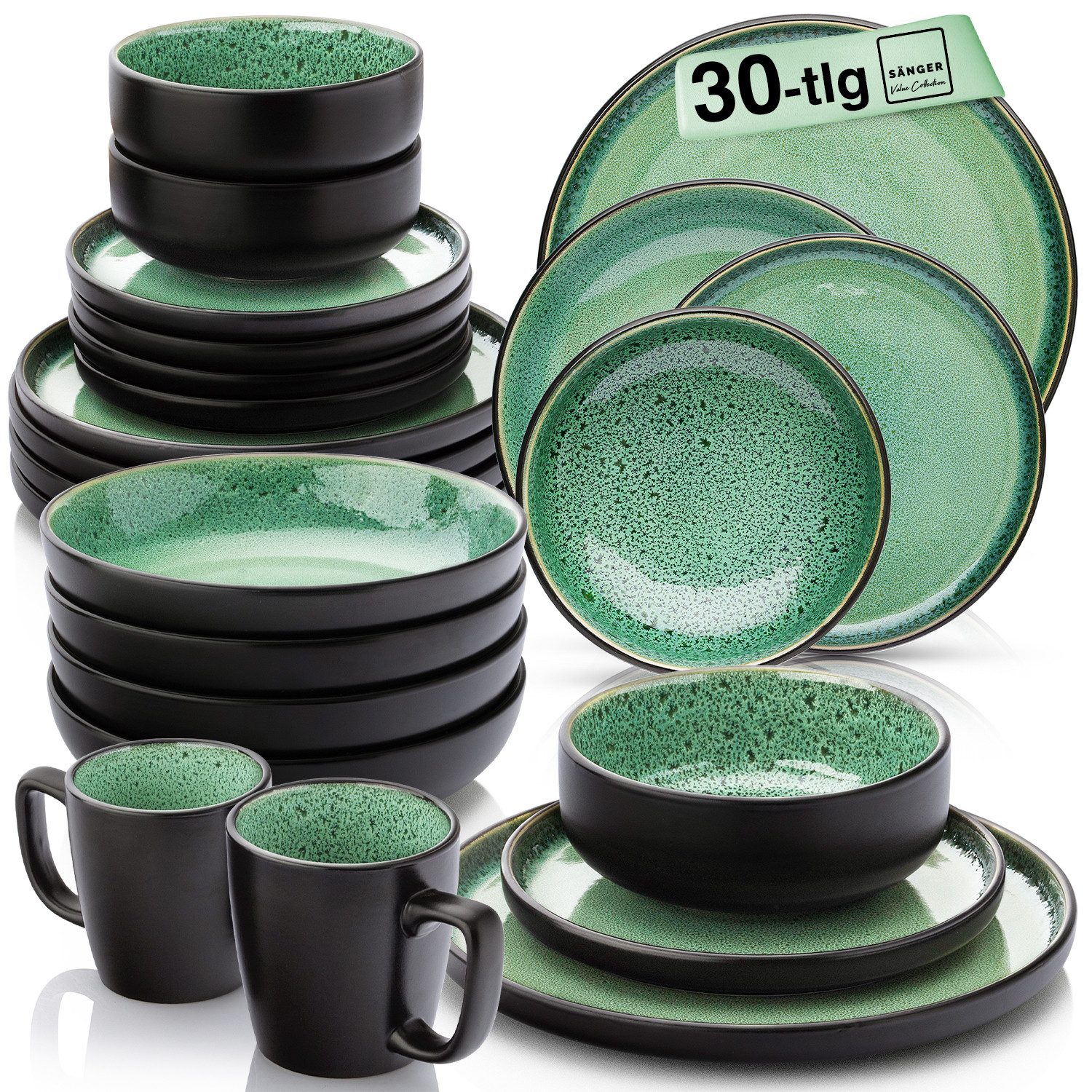 Die charakteristische grüne Glasur mit einem feinen schwarzen Rand macht jedes Teil zu einem Unikat. Ob beim gemütlichen Frühstück oder einem stilvollen Abendessen – das Service überzeugt durch seine kraftvolle Farbe und den handwerklichen Touch.