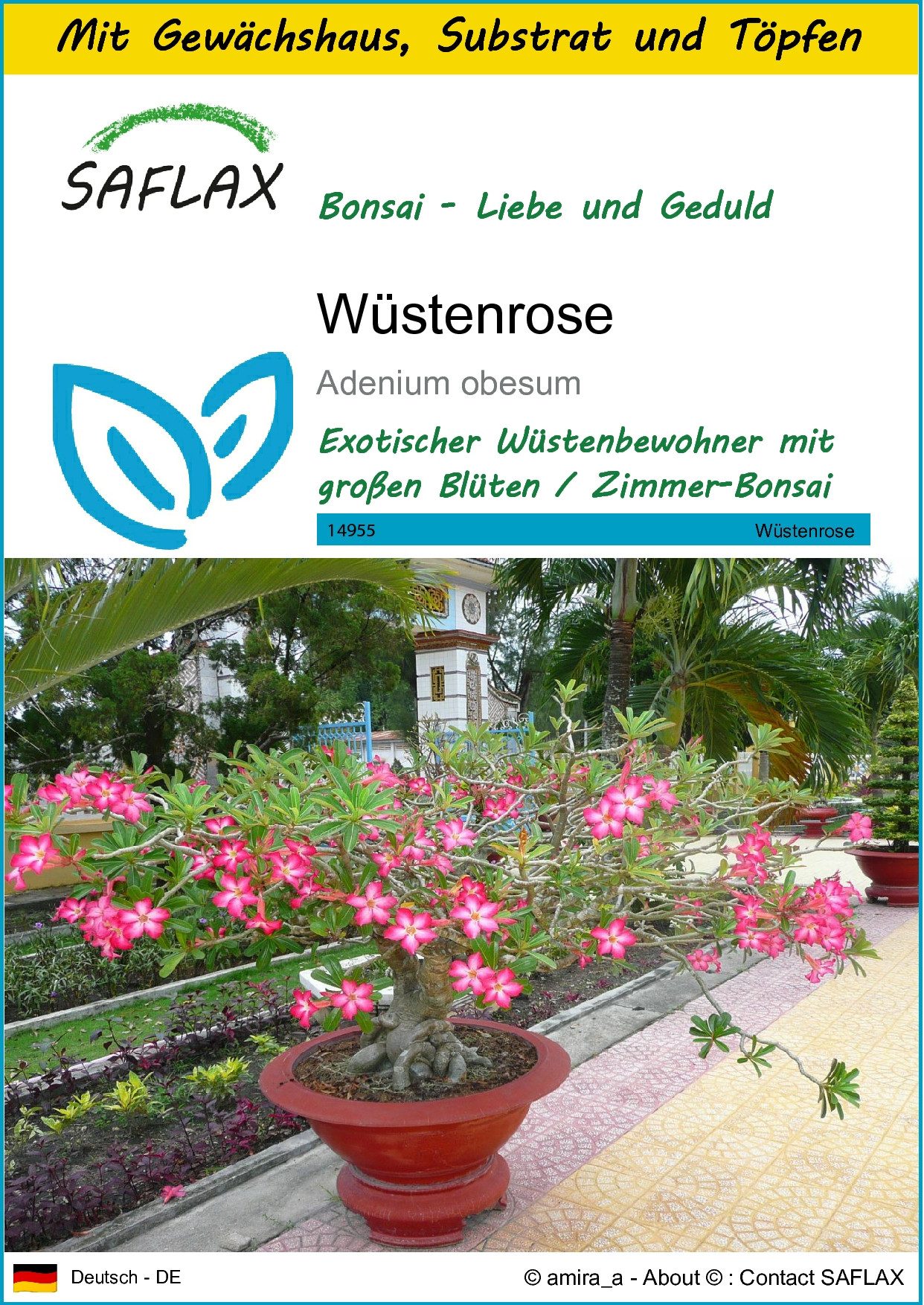 Wissenswertes: Die exotische Wüstenrose blüht auf einem bizarren, wasserspeichernden Sukkulenten-Stamm (Caudex), den die Pflanze aufgrund ihres ursprünglichen Lebensraumes als Anpassung zur Wasserspeicherung entwickelt hat. Sie erfreut den Bonsaifreund mit einer reichhaltigen Blütenfülle, die die gesamte Pflanze mit fünf Zentimeter großen rosaroten Blüten überzieht.