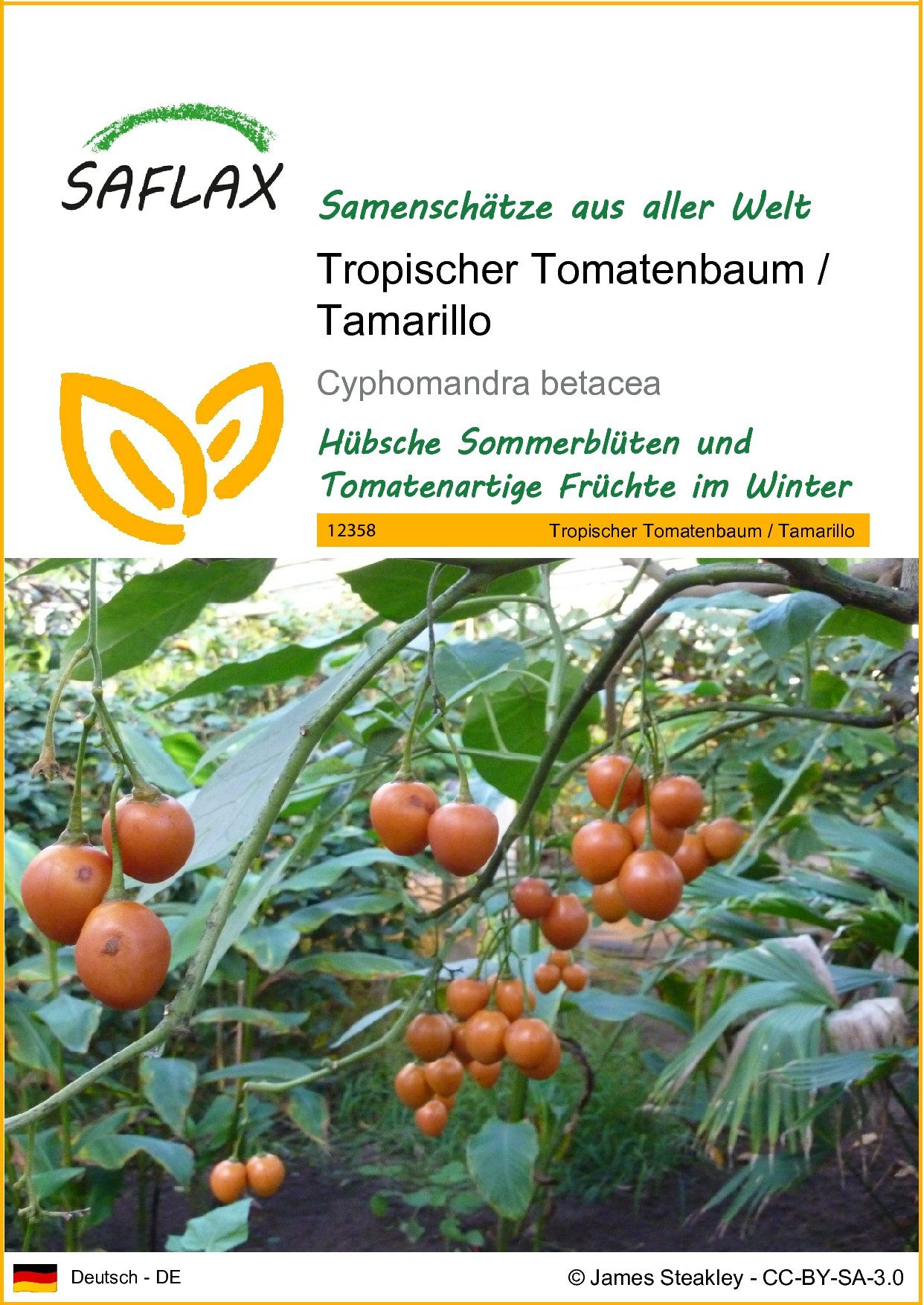 Wissenswertes: Die immergrüne Baumtomate entwickelt nur einen Trieb, der baumartig verholzend wächst, sich erst spät verzweigt und große, weich behaarte Blätter ausbildet. Sie wächst schnell und erreicht auch im Kübel durchaus Zimmerhöhe. Aus den lavendelfarbenen zwittrigen (selbstbestäubenden) Blüten entwickelt die Tamarillo kleine, eiförmige rote oder gelbe Früchte. Der Geschmack der einer Roma Tomate ähnelnden länglichen Früchte ist etwas eigentümlich und erinnert entfernt an Tomate. Am besten sind nicht ganz ausgereifte Früchte - sie schmecken angenehm süß-säuerlich. Zu Tomaten besteht nur insoweit eine botanischen Verwandtschaft, als dass beide der Familie der Nachtschattengewächse (Solanaceae) angehören. Man kann das Fruchtfleisch direkt aus der Schale löffeln, in Obstsalate mischen oder als Gemüse dünsten.