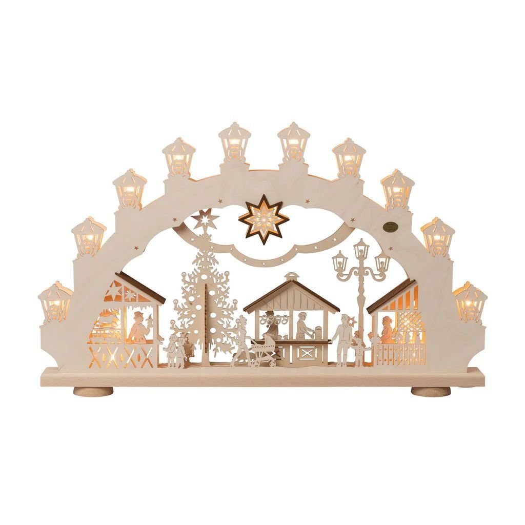 Weihnachtsmärkte gehören zu den beliebtesten Motiven auf Schwibbögen. Diese Варианты überzeugt durch hohen Detailreichtum und besonders feine Ausarbeitung. Im Zentrum schwebt der beleuchtete Weihnachtsstern über dem Markttreiben und dem Weihnachtsbaum, der von handwerklicher Perfektion zeugt. Der Ursprung dieses wunderschönen und mit einer Длина von 66 Zentimetern opulenten Lichterbogens liegt im Erzgebirge. Es handelt sich um Volkskunst Made in Germany. 15 Lichter erhellen die Szenerie. Dadurch, dass die Bogenlichter hinter kleinen Laternen versteckt sind, wirkt die Beleuchtung besonders dezent und wirklichkeitsnah. Die Leuchtmittel lassen sich tauschen. Kaufen Sie im Shop gleich ein paar Ersatzglühlampen dazu! Für einen besonderen Schwibbogen empfiehlt sich auch eine entsprechende Erhöhung. Bei uns finden Sie das passende Zubehör. Für den Netzbetrieb geeignet. BxHxT 66x40x6cm NEU |